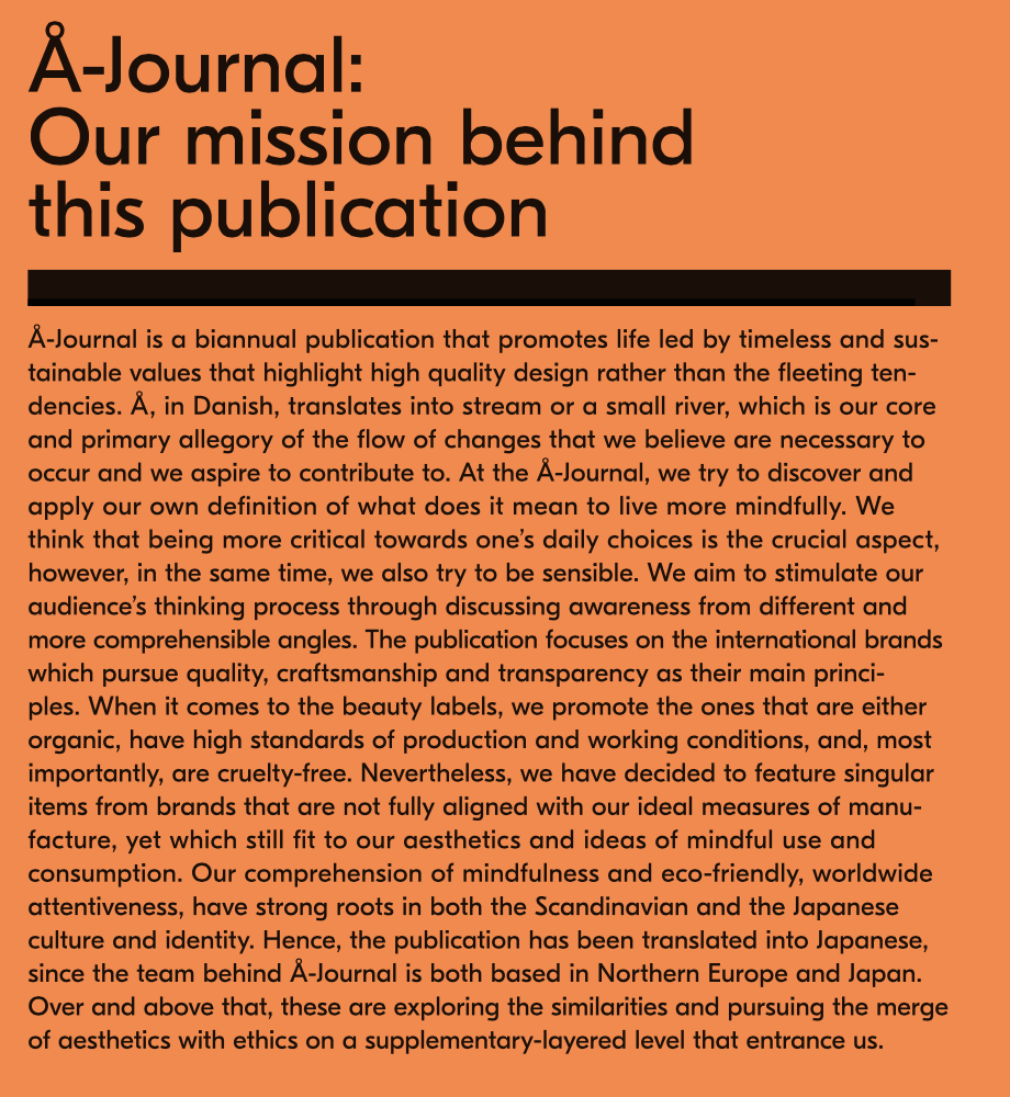 Å Journal is a Copenhagen based international print publication that is all about the subject of mindful living and consumption. It’s also translated into Japanese as we have a lot of our contributors and team based in Japan.
