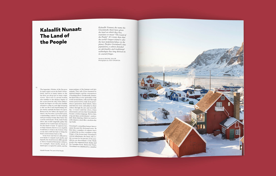 The Frozen Volume explores the raw, fragile and compelling landscapes of our polar and mountainous wildernesses. It includes stories about thrilling outdoor pursuits, from Nordic skating on the vast and numerous lakes of Sweden, to dogsledding across frozen fjords and into wild snow-cloaked mountains, to braving the cold, paddling out and surfing in arctic waters. It features one man’s adventure to collect the world’s most comprehensive collection of snowshoes and his attempt to preserve the dying art of traditional snowshoe making; and one woman’s commitment to enduring the seasons and tending a weather station in the remote wilds of Iceland. It learns lessons in glaciology, discusses our complex relationship with our planet’s changing climate, and uncovers the plight of equatorial glaciers. This volume’s travel section ventures to the frigid coast of Greenland, a landmass dominated by ice and home to a culture founded on spirituality and traditional technologies.