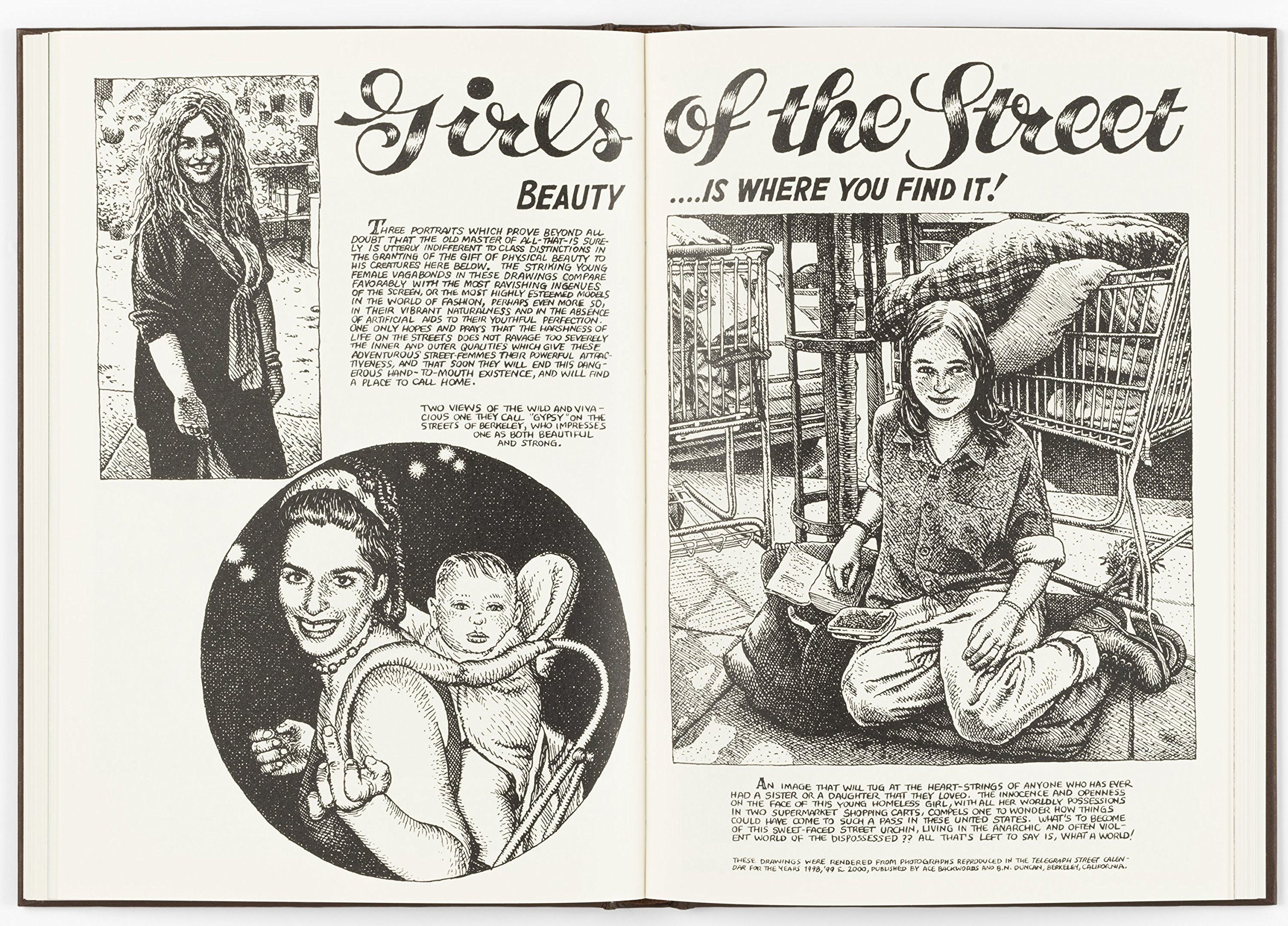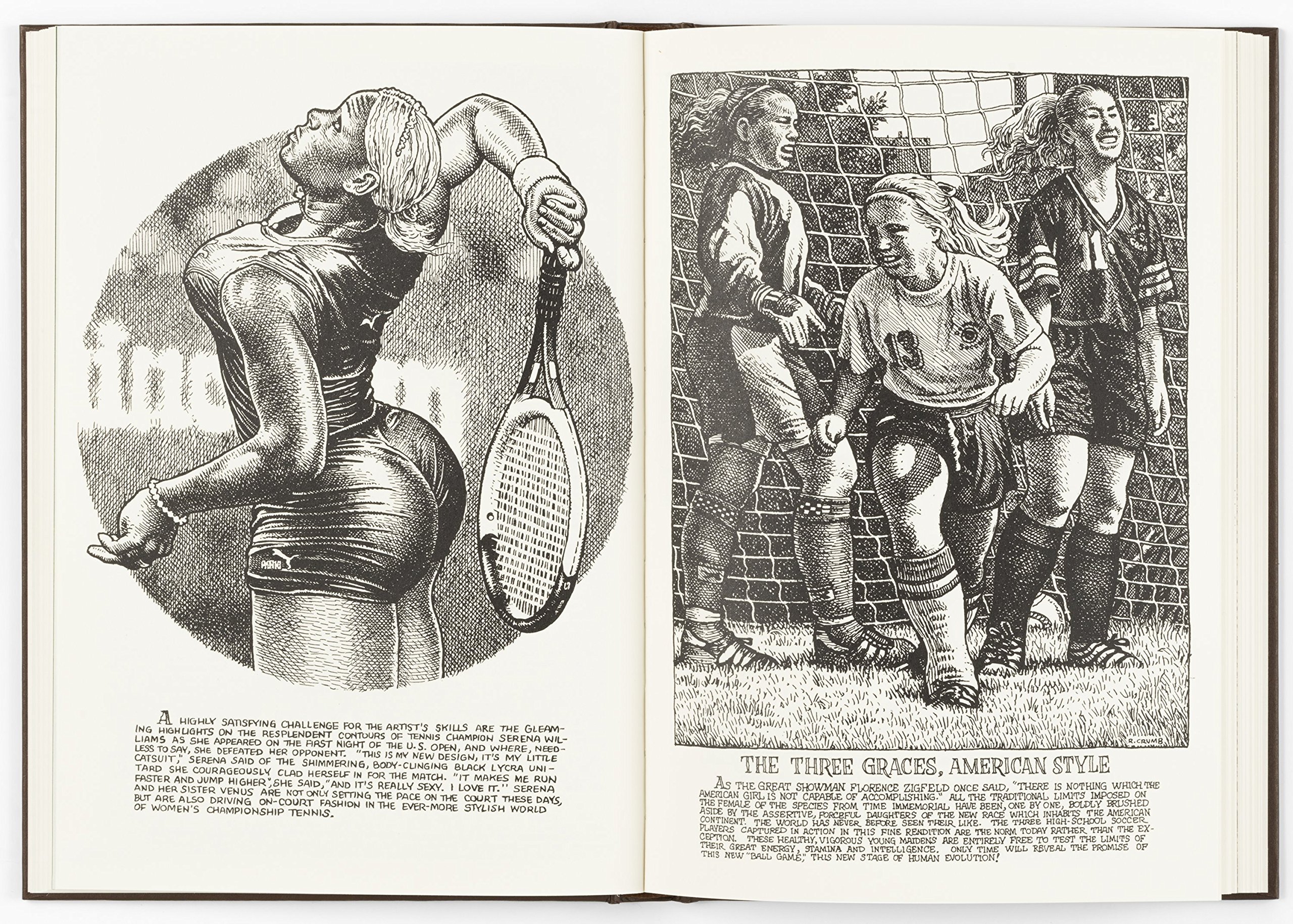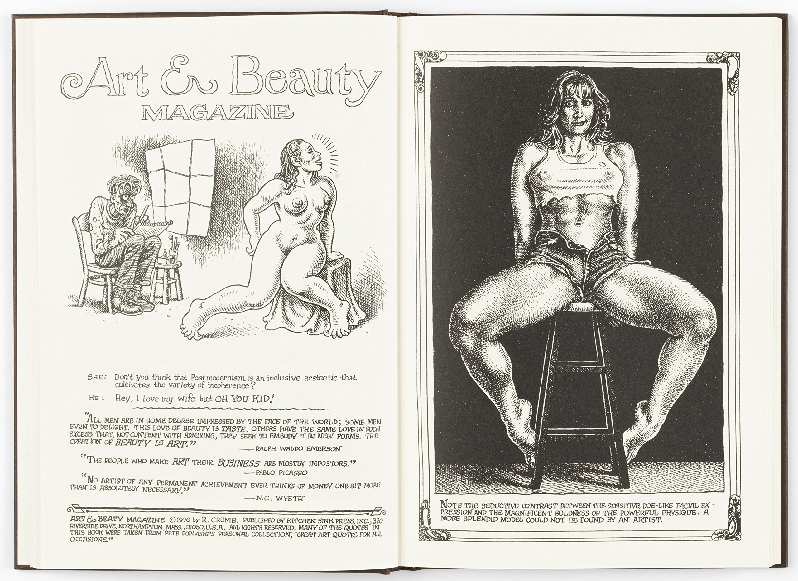 Art & Beauty: Number 1, originally published by Kitchen Sink Press in 1996, is at once a satirical take on aesthetics and a continued exploration of Crumb’s subversion of sexuality and mainstream values. Drawings of women in positions ranging from lascivious to modest are accompanied by quotations, many of which are from artists such as Leonardo da Vinci and Harvey Kurtzman. Mining his own obsessions and fantasies, Crumb reimagines the history of art, challenging social mores and expectations of propriety around the female form.