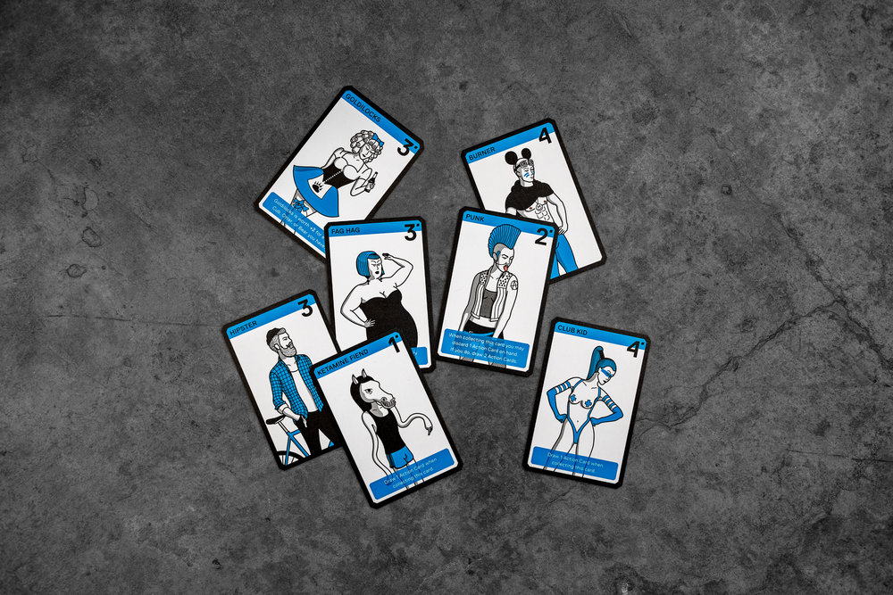 Bergnein is a fast and fun game that mixes strategy and luck, that both non-gamers and game night veterans can enjoy. With mechanics inspired by Guillotine but with a more culturally relevant theme, the game takes place in the line of the world’s perhaps most notorious night club.