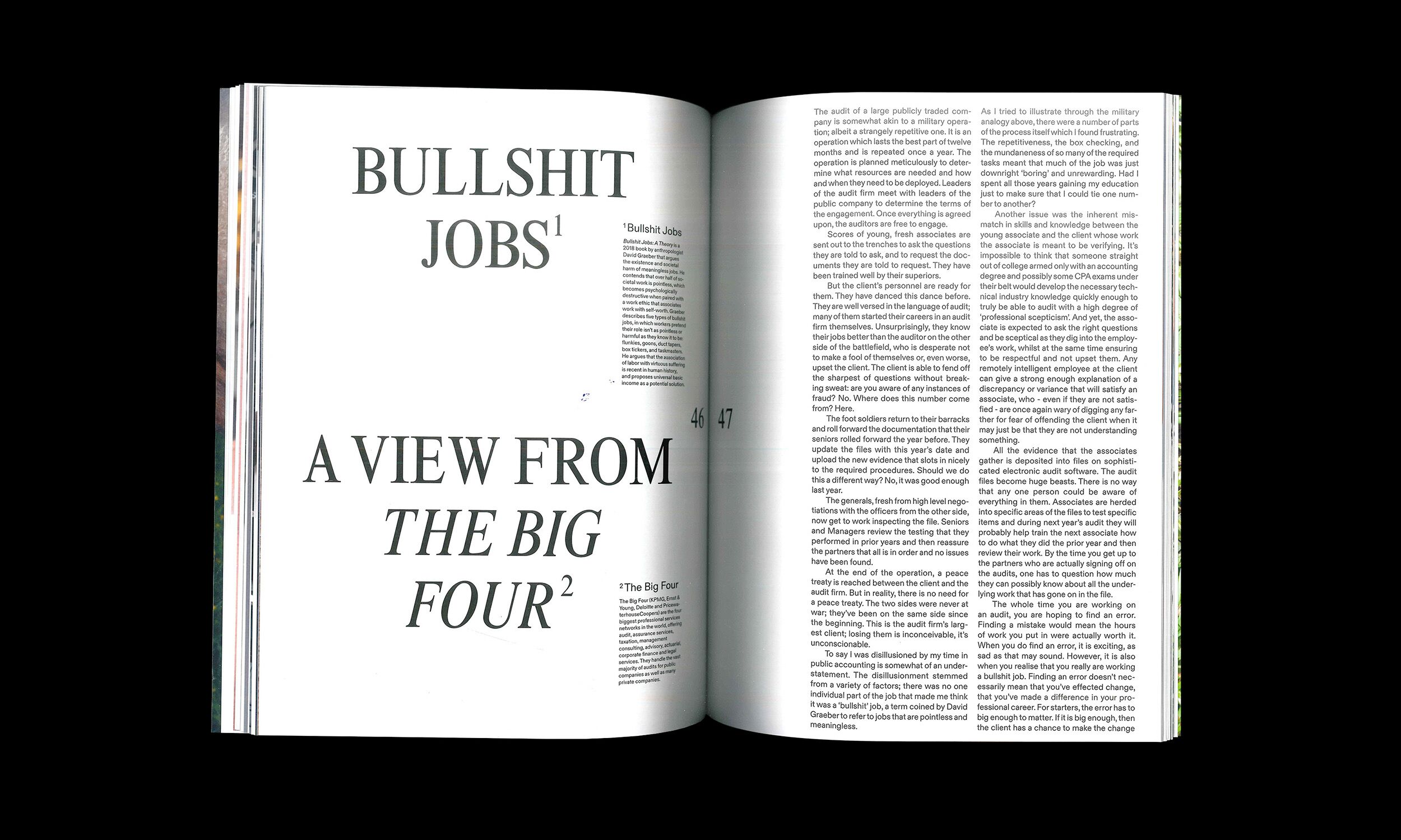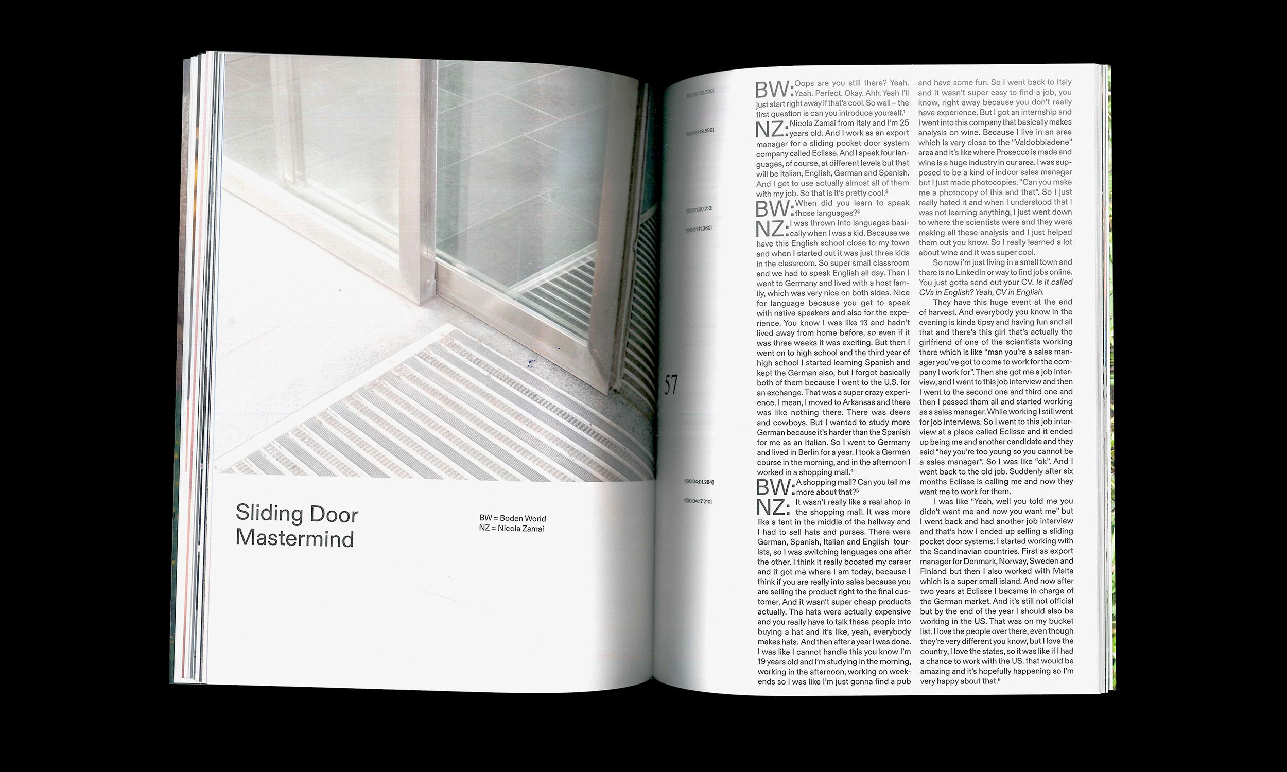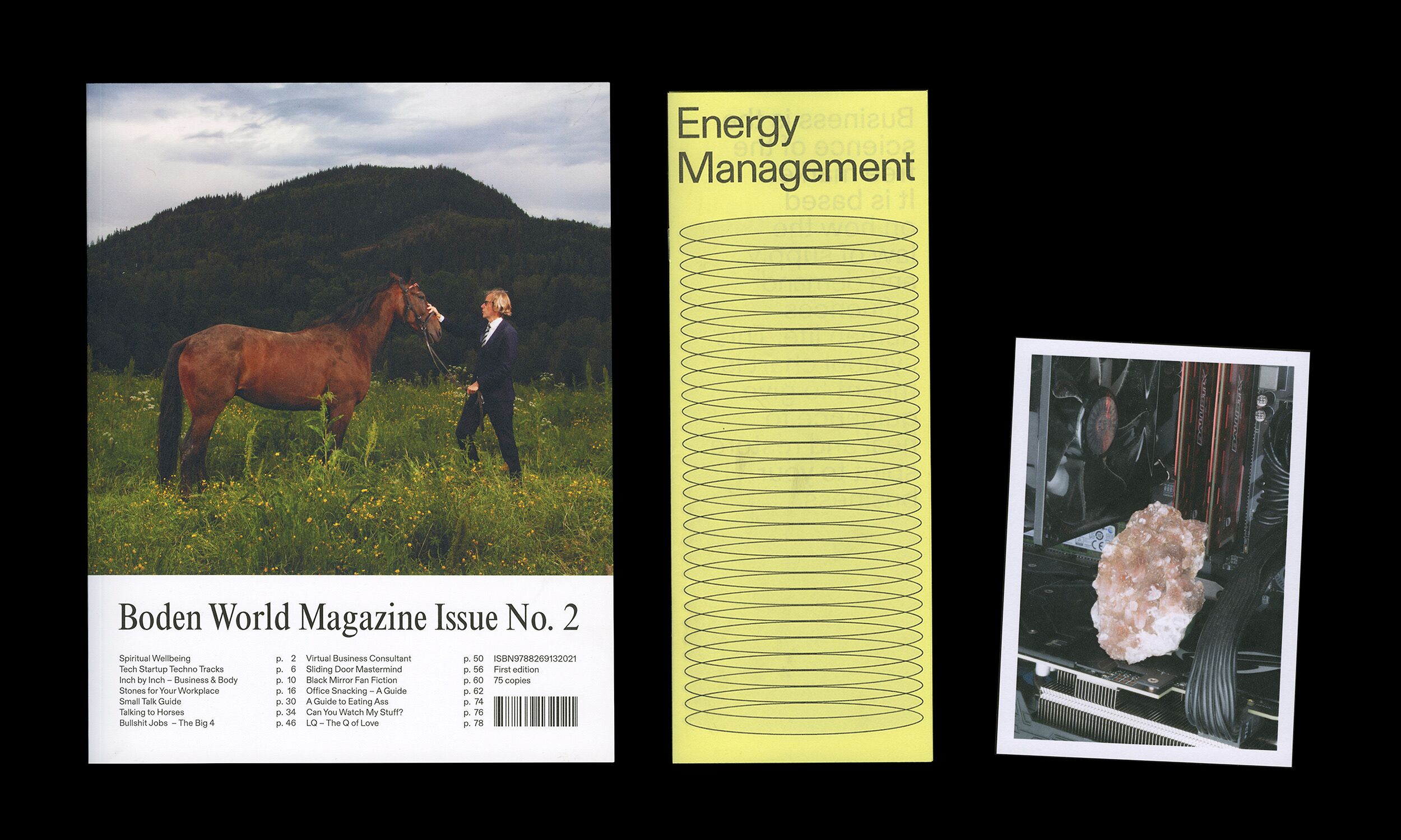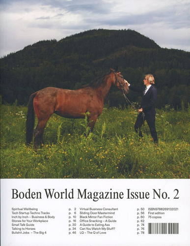Boden World explores the aesthetics, rhetorics and semantics of business from a youth perspective. Issue No. 2 features interviews with bodybuilders & sliding doors salesmen, essays on spiritual wellbeing & eating ass at work, photo editorials on horse whispering, energy crystals & office food, as well as guides to small talk and the top techno tracks for tech startups.