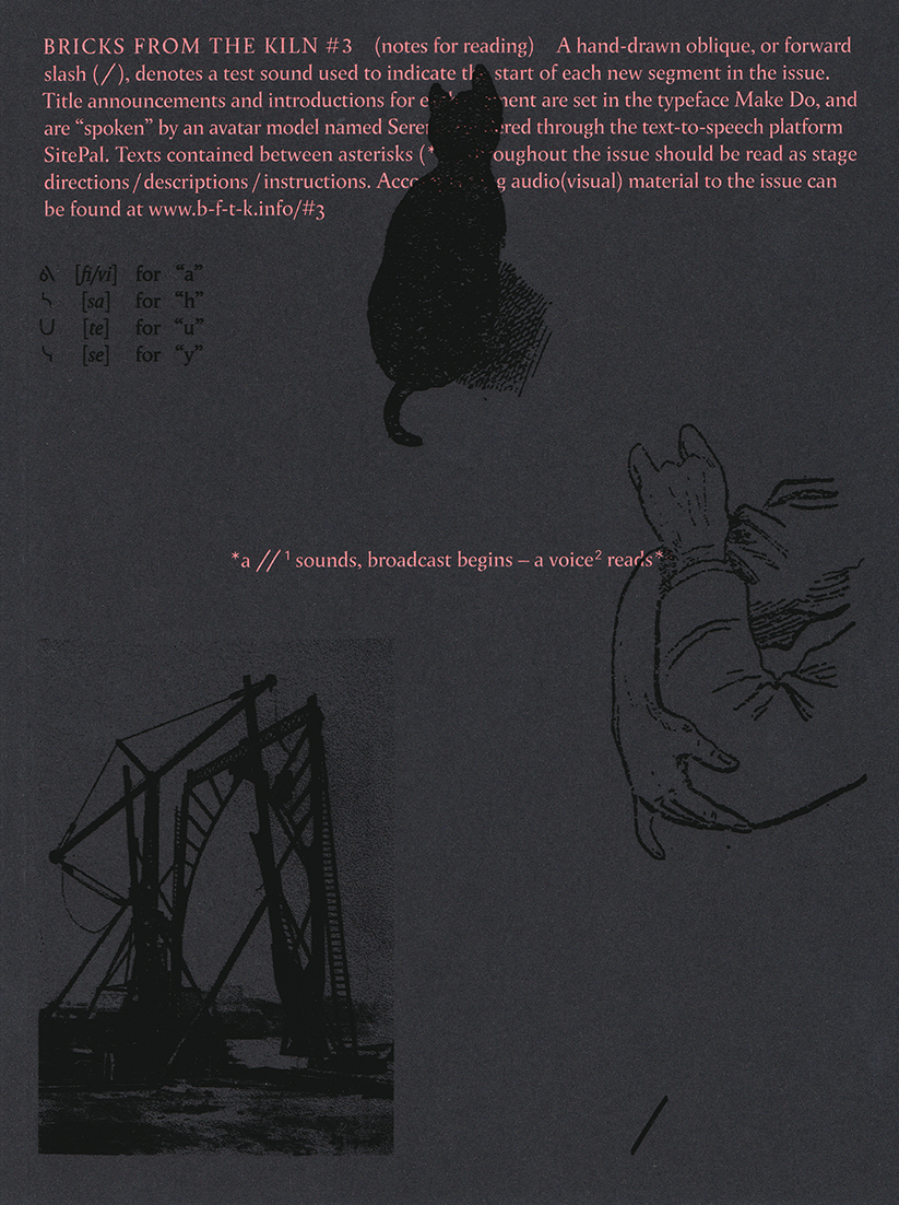 Bricks from the Kiln is an annual journal edited and designed by Andrew Lister and Matthew Stuart from between London and Chicago. It takes its name from the glossary notes of Ret Marut’s Der Ziegelbrenner (1917–1921) and pulls together writings, investigations and ongoing bodies of research often begun but forced aside.