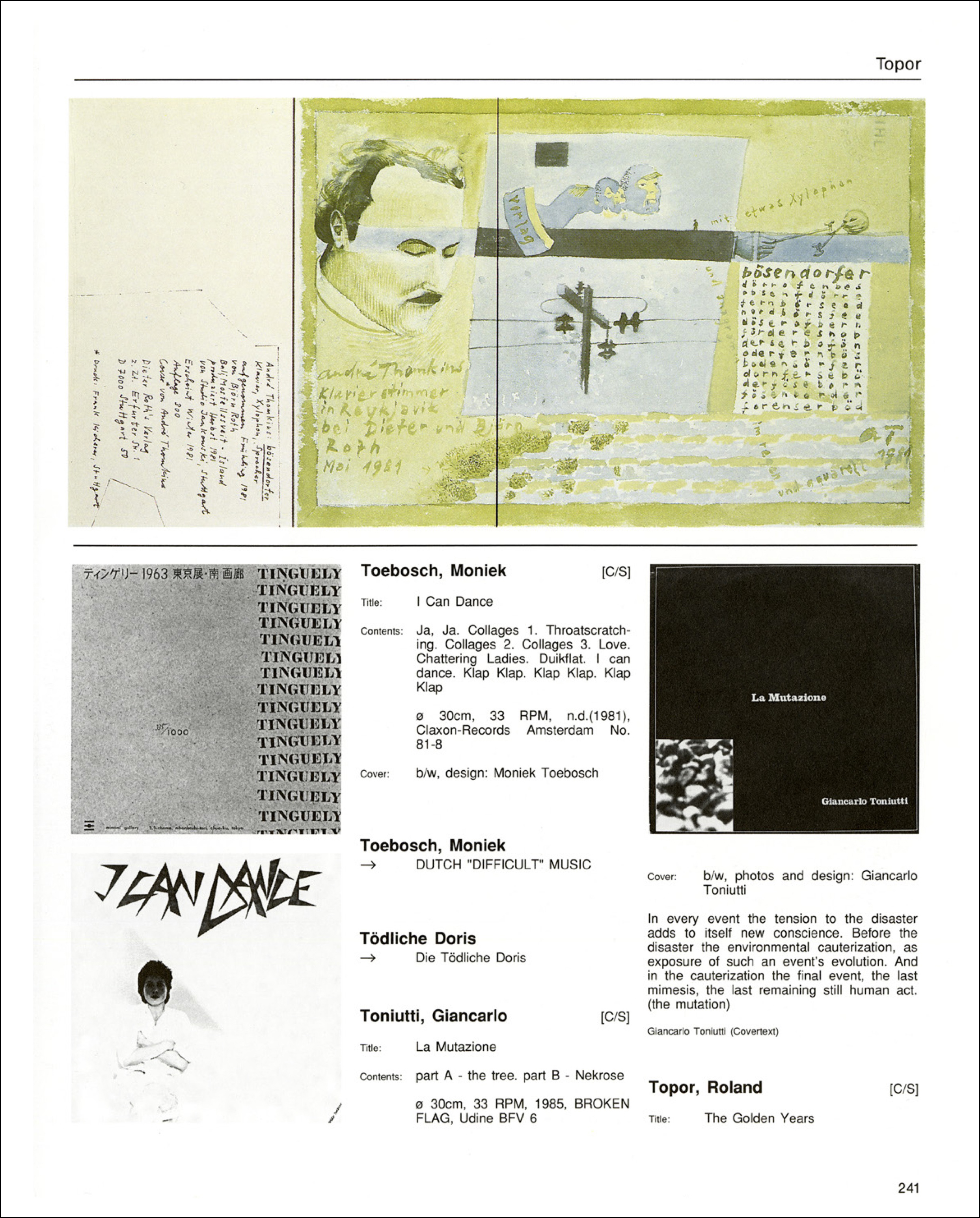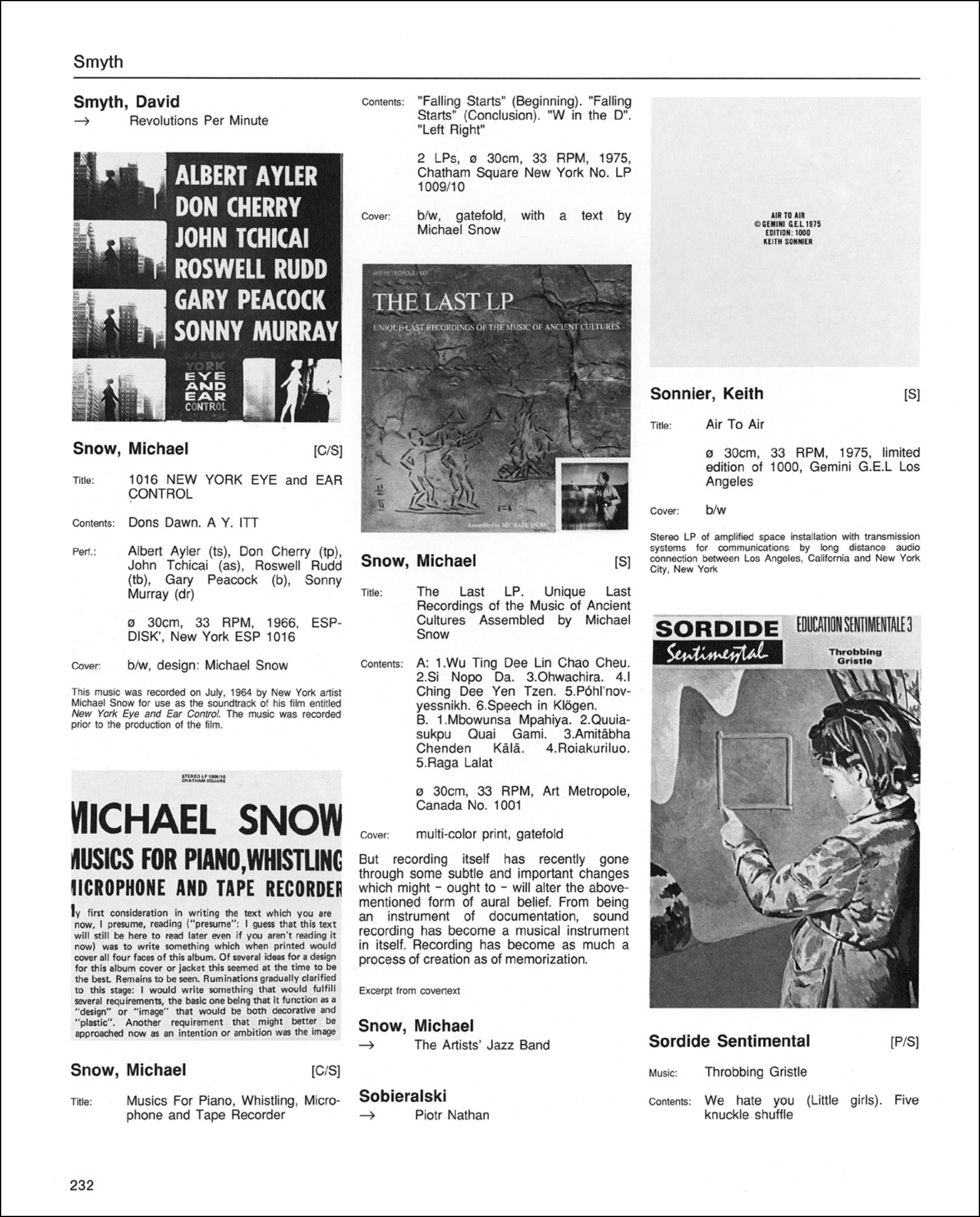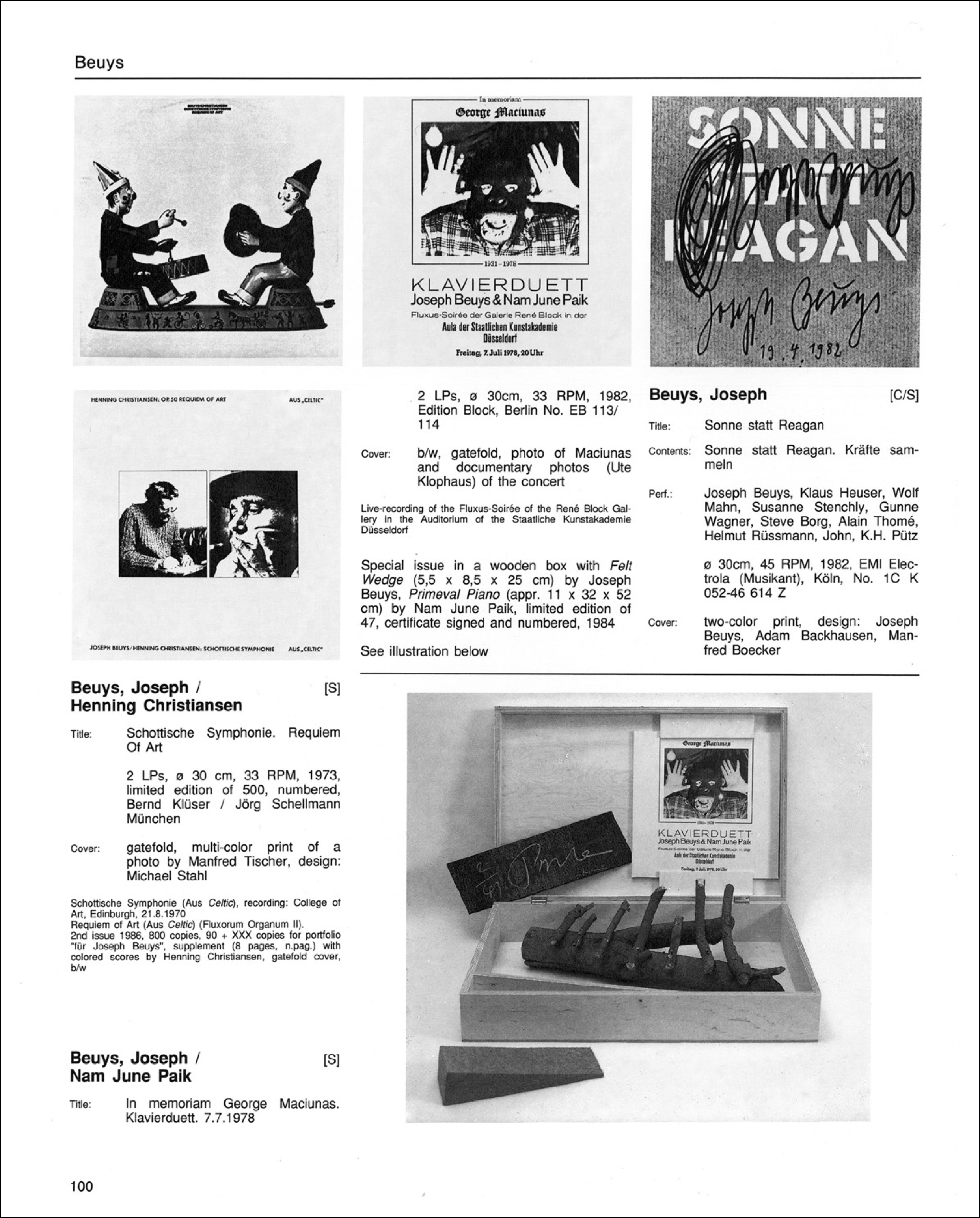 It also includes essays by both editors as well as Theodor W. Adorno, René Block, Jean Dubuffet, Milan Knizak, László Moholy-Nagy, Christiane Seiffert, and Hans Rudolf Zeller, as well as a flexi disc of the Arditti Quartet performing Knizak’s “Broken Music.” The centerpiece of the publication is a nearly 200-page bibliography of artists’ records.