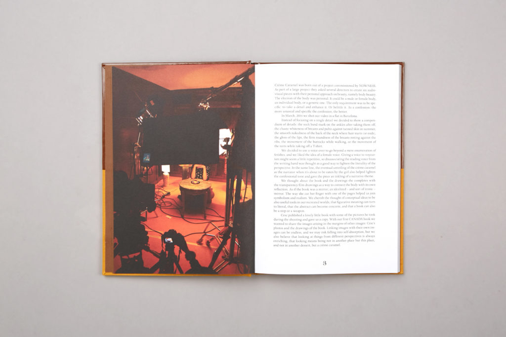 Crème Caramel is a project by renowned Barcelona based production house and editorial studio CANADA. A short film born out of a commission from NOWNESS, which ended spinning off into an object and new line of projects: CANADA books. “A behind the scenes of Crème Caramel” is the first issue of what has become a first editorial collection of three book for CANADA. Together the publications form a triptych, ranging from small to tall in size. The book had to become a representation of the video and shooting process, including three of its foremost characteristics, which would ultimately define the publication’s character and style: attention towards the bodily details of the protagonist, playfulness, and a narrating flan.