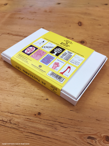 This box contains 24 postcards (some of which that can’t be purchased as single postcards) and also a one off design from the artist not available anywhere else.