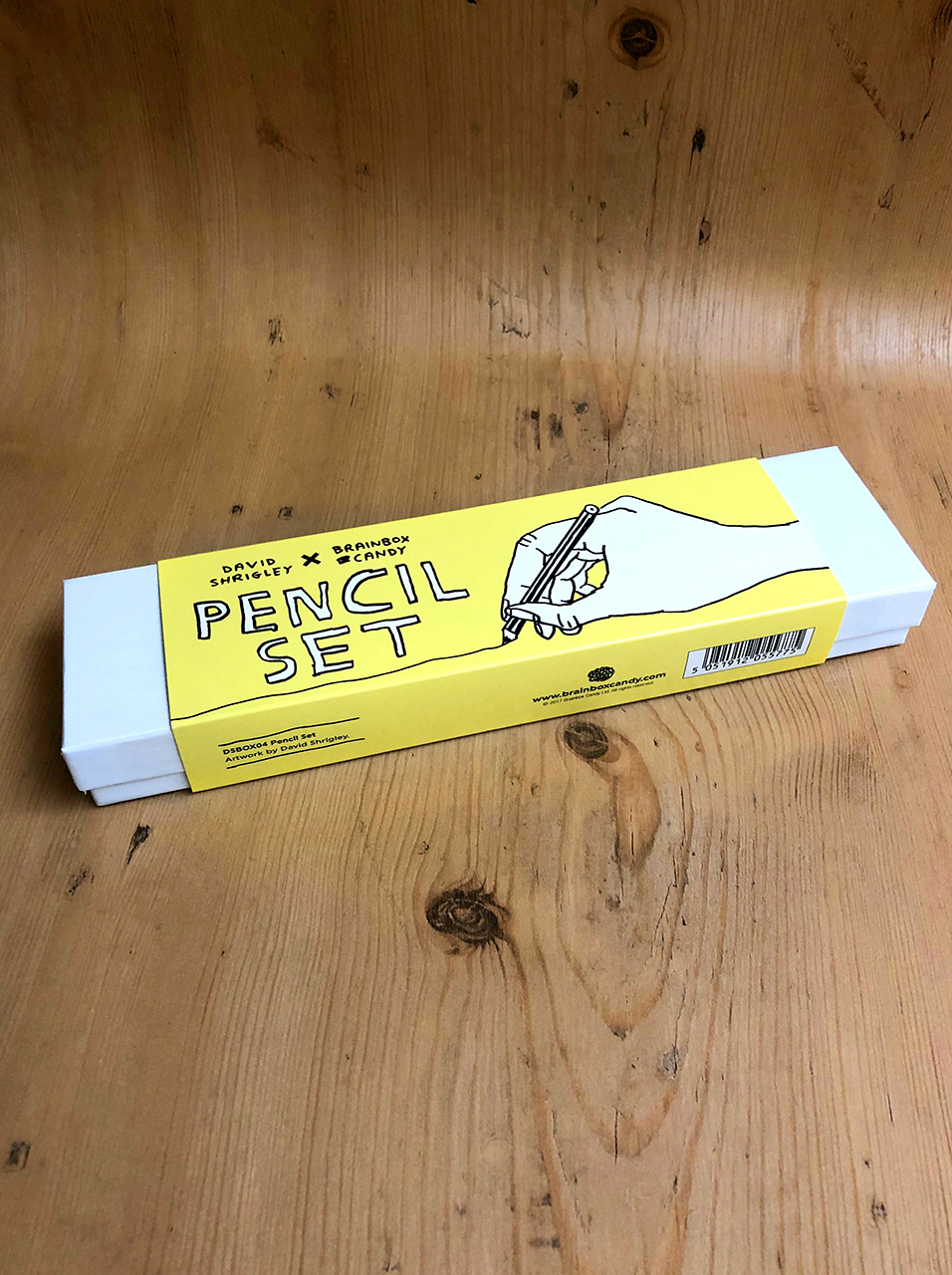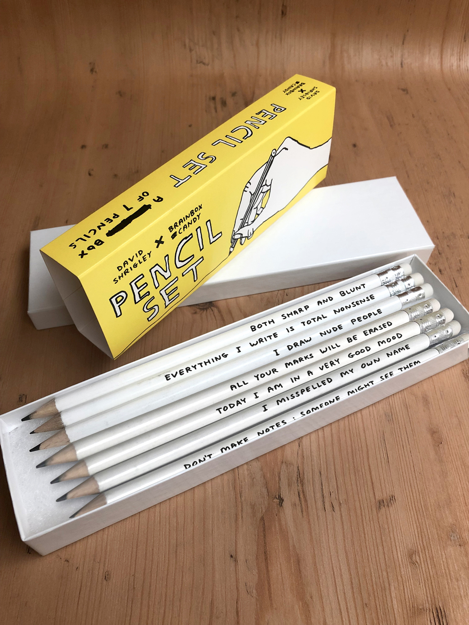 7 awesome David Shrigley pencils packaged in a gorgeous box and bellyband package.