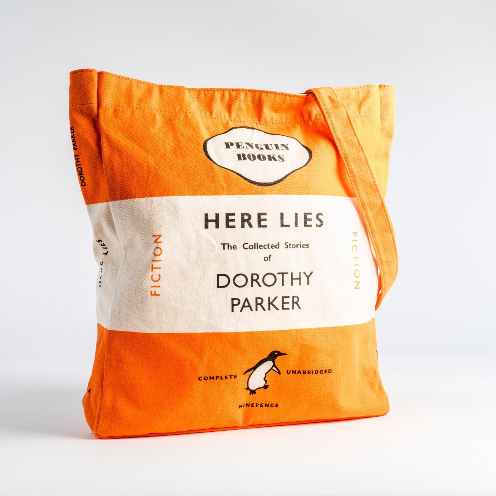 A bright and wonderful canvas bag in iconic Penguin orange, featuring the cover of Here Lies – The Collected Stories of Dorothy Parker.