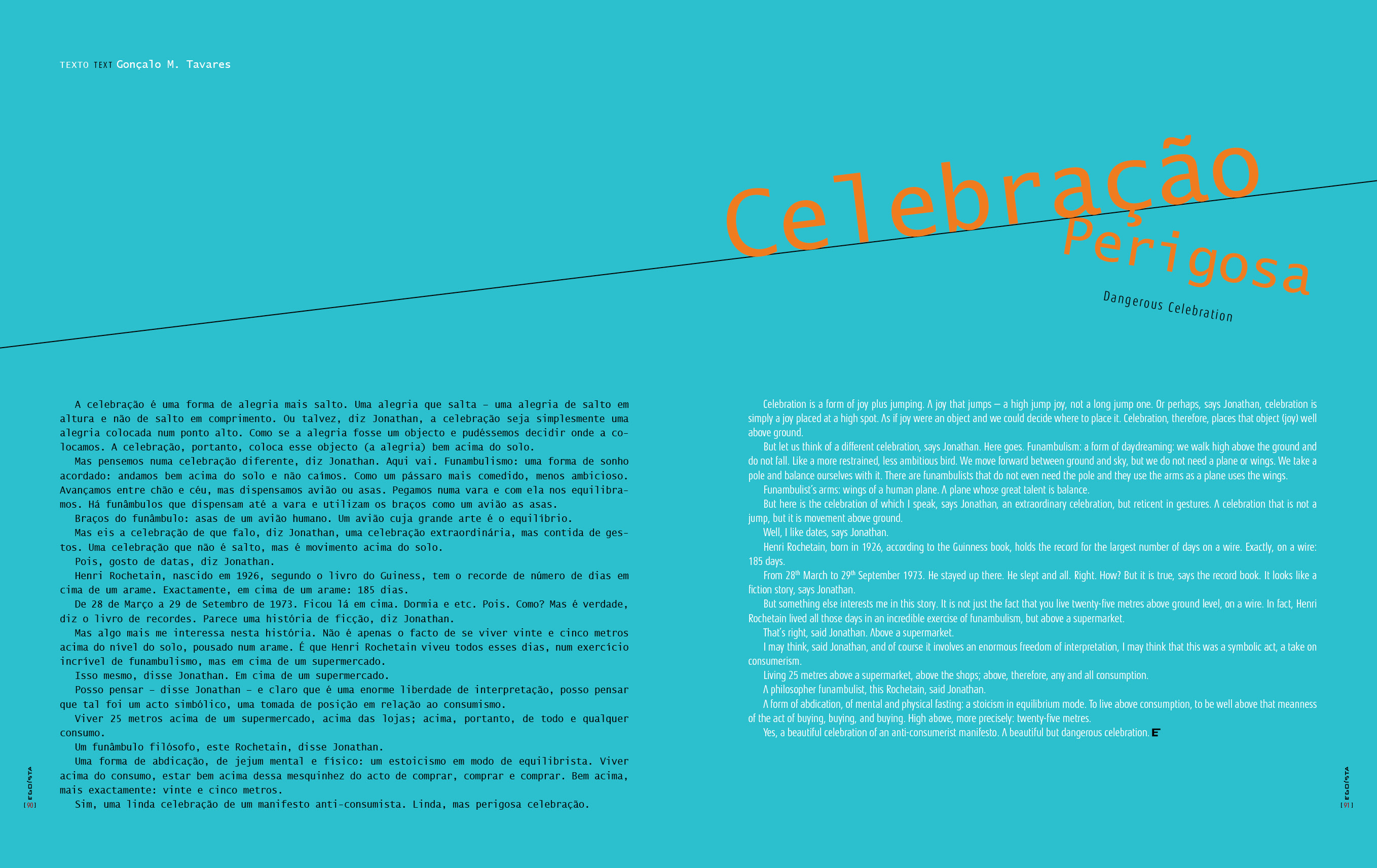 David Machado writes “This is what she is”, whereas Gonçalo M. Tavares authors “Dangerous Celebration.”
