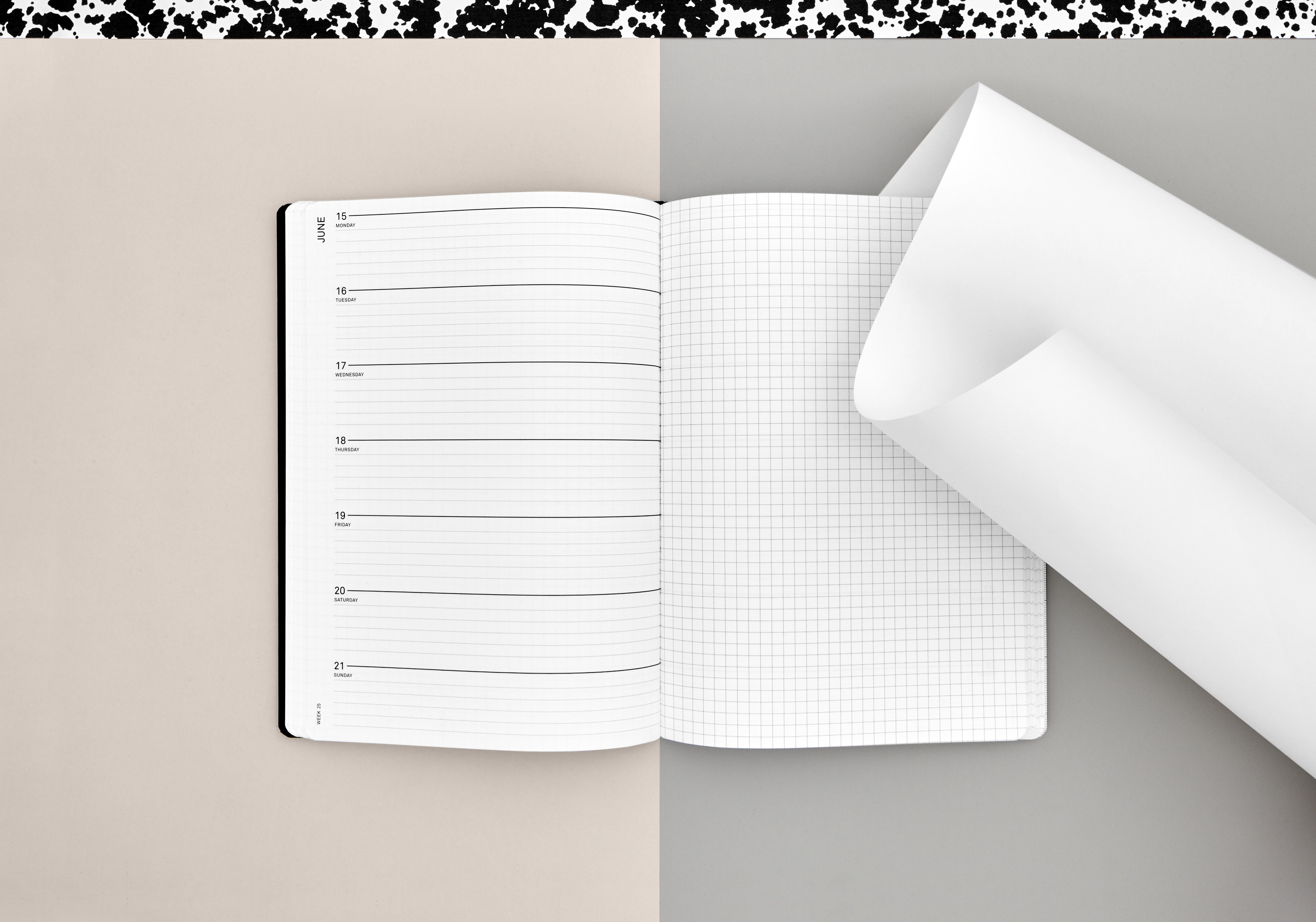 The Els & Nel 2020 Weekly Journal is designed in Amsterdam by design duo Els & Nel in a self-published edition. The journal is formatted to show all weekdays in horizontal blocks on the left page and is complemented by a square page for notes on the right.