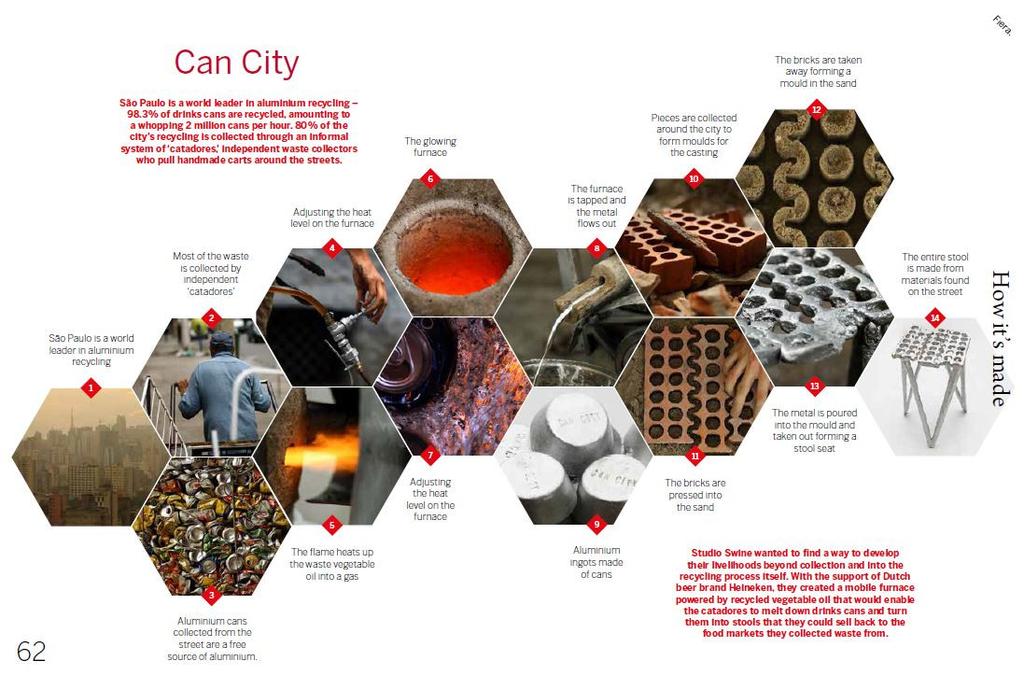 -Next we explore some of those objects in more detail: How It’s Made tracks the design and making process behind a project called Can City – Studio Swine’s attempt to extend the livelihood’s of San Paolo’s ‘catadores’ – those who collect waste for recycling, by creating a product they can make from the aluminium cans they collect and sell back to the cafes they collect them from.