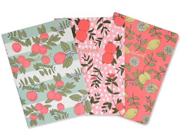 Fresh as fruits picked straight from the tree, this trio of notebooks features vibrant cover artwork of pomegranates, lemons and oranges accented with bright bursts of neon ink.