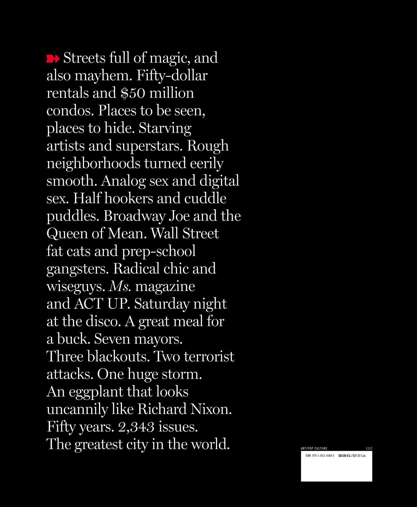 Since its founding in 1968, New York Magazine has told the story of that city’s constant morphing, week after week. Covering culture high and low, the drama and scandal of politics and finance, through jubilant moments and immense tragedies, the magazine has hit readers where they live, with a sensibility as fast and funny and urbane as New York itself. From its early days publishing writers like Tom Wolfe, Jimmy Breslin, and Gloria Steinem to its modern incarnation as a laboratory of inventive magazine-making, New York has had an extraordinary knack for catching the Zeitgeist and getting it on the page. It was among the originators of the New Journalism, publishing legendary stories whose authors infiltrated a Black Panther party in Leonard Bernstein’s apartment, introduced us to the mother-daughter hermits living in the dilapidated estate known as Grey Gardens, launched Ms. Magazine, branded a group of up-and-coming teen stars “the Brat Pack,” and effectively ended the career of Roger Ailes. Again and again, it introduced new words into the conversation—from “foodie” to “normcore”—and spotted fresh talent before just about anyone.