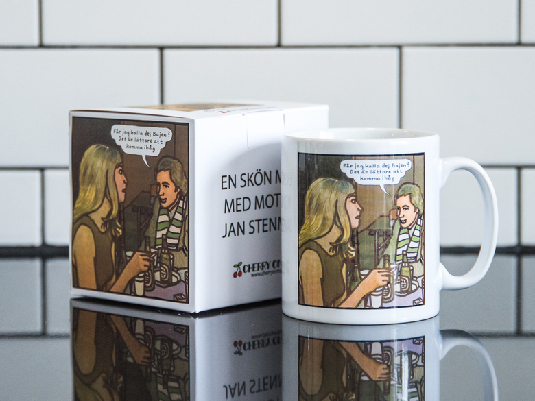 Populär mugg med motiv av serietecknaren Jan Stenmark. “Bajen”.Får jag kalla dig Bajen? Det är lättare att komma ihåg. Motivet upprepar sig på båda sidor muggen.