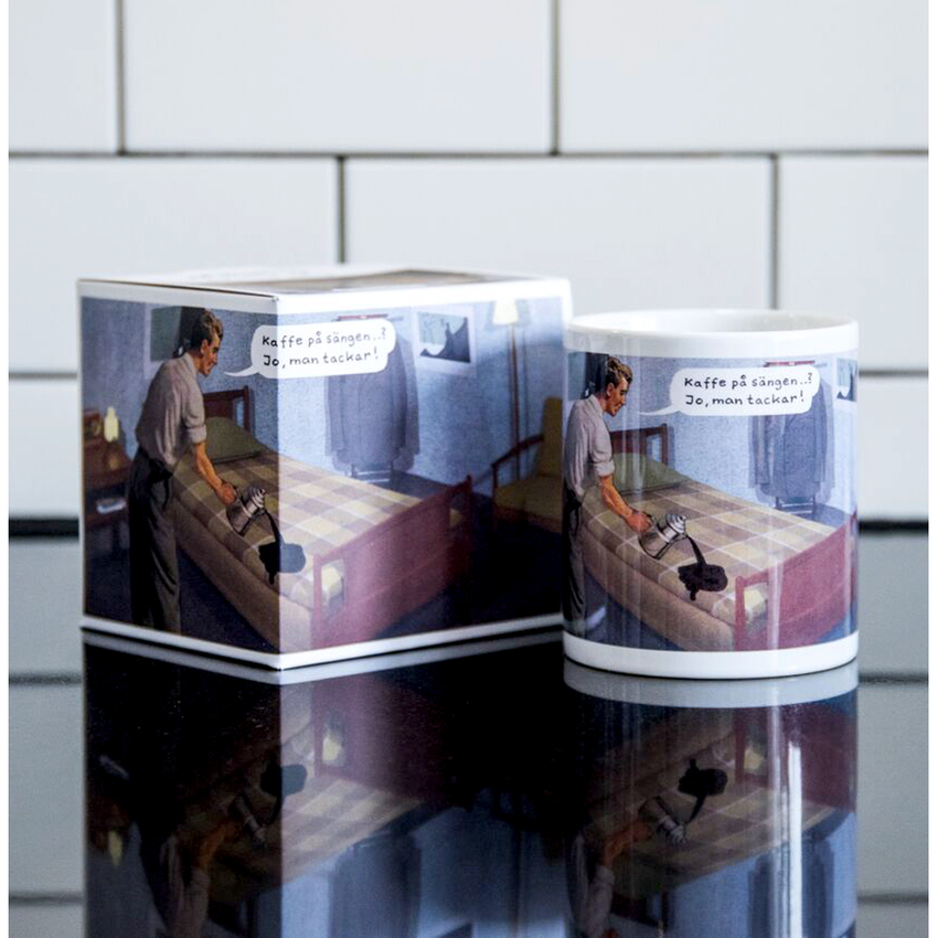 Populär mugg med motiv av serietecknaren Jan Stenmark. “Kaffe på sängen”. Motivet går runt hela muggen.