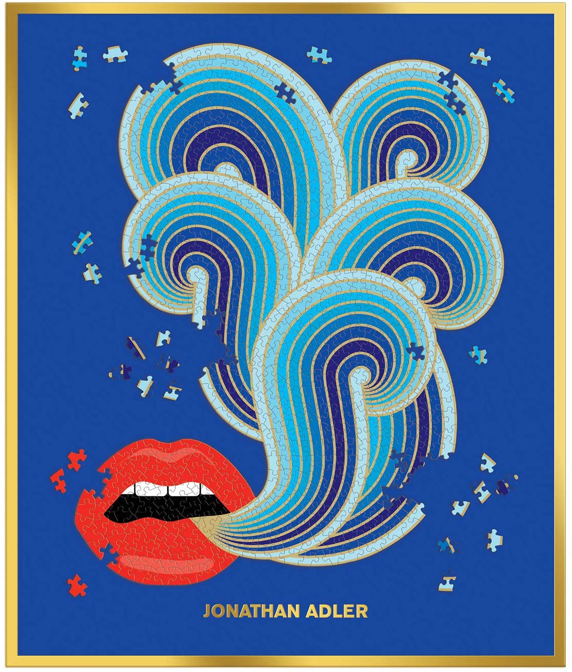 The Jonathan Adler 750 Piece Lips Shaped Puzzle from Galison features Adler’s signature swirling smokestack lips pattern.