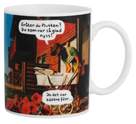 Jan Stenmarks bilder liknar inget annat. Med dialogen: “Jag är ledsen, men kaffet är visst slut”, ”Det är det mellan oss också, din odugling”. Levereras i fin presentkartong: 118 x 88 x 105 mm (bredd/djup/höjd). Kopp: 80 mm diameter; 98 mm hög. Vit porslinskopp med öra, tryck runt om.