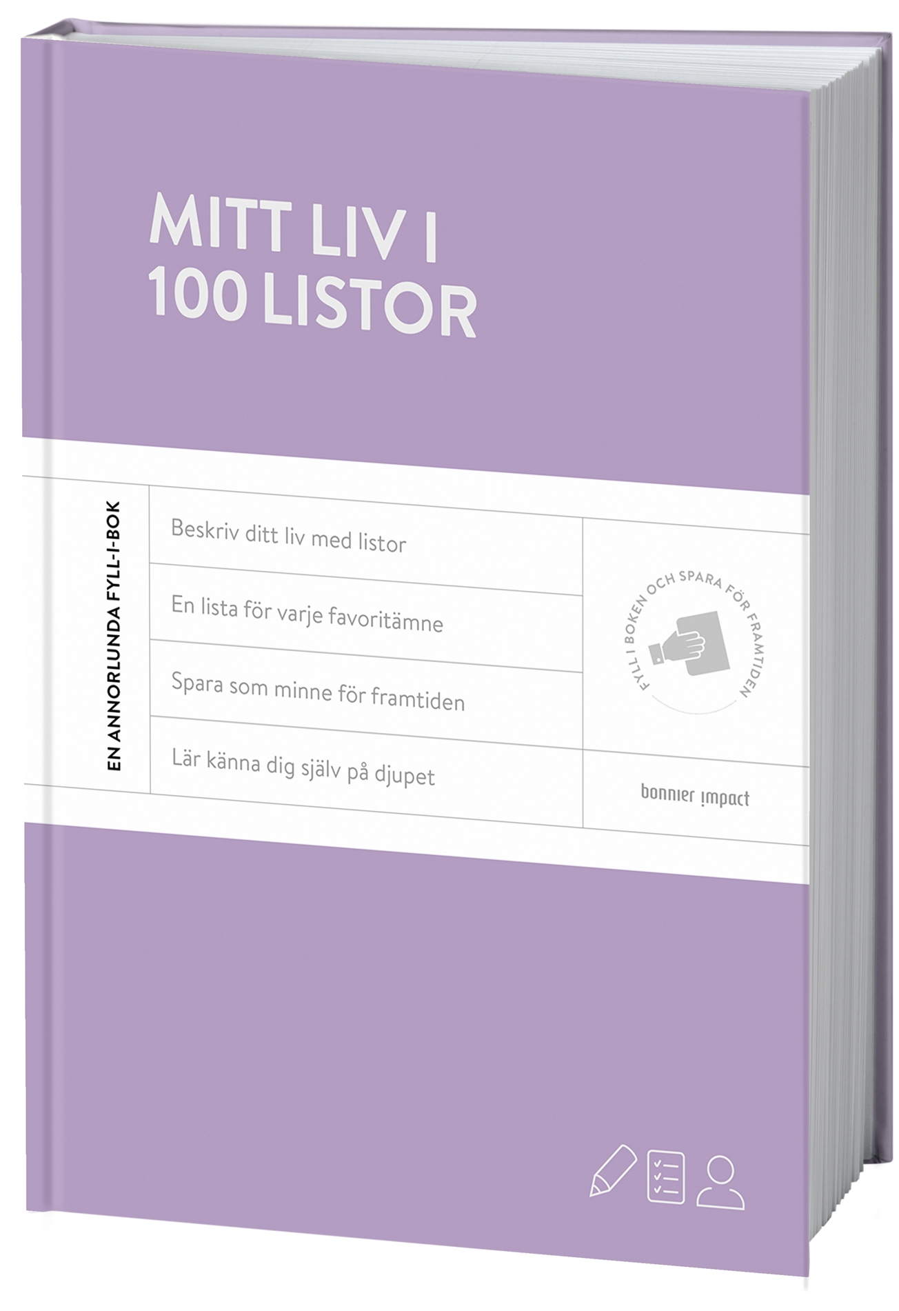Med den här boken får du ditt liv sammanfattat i totalt 100 listor. Du kan samla minnen, planera framtiden, lära känna dig själv på djupet eller helt enkelt skratta åt dig själv. I framtiden kan du kolla om du fortfarande har samma inställningar, om dina planer blev av och hur du har utvecklats och förändrats sedan dess. Använd för dig själv eller ge bort den till någon du tycker om!