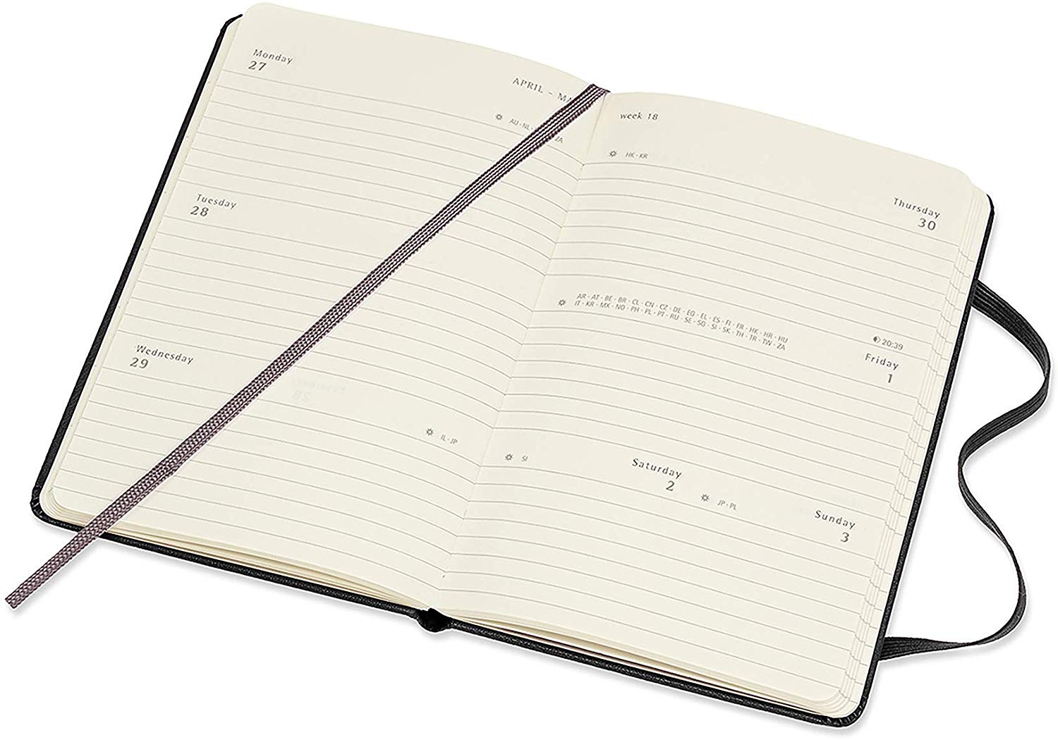 The Moleskine Weekly Notebook is dated from January to December. Formatted to show the week’s appointments on the left and a ruled page for notes and ideas on the right, it is a handy and versatile planner that incorporates the freedom of a notebook.
