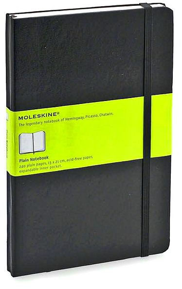 This basic, yet classic Large Plain notebook is one of the best-selling Moleskine notebooks. This reliable travel companion, perfect for sketches, thoughts and passing notes, has a cardboard bound cover with rounded corners, acid free paper, a bookmark, an elastic closure and an expandable inner pocket that contains the Moleskine history.