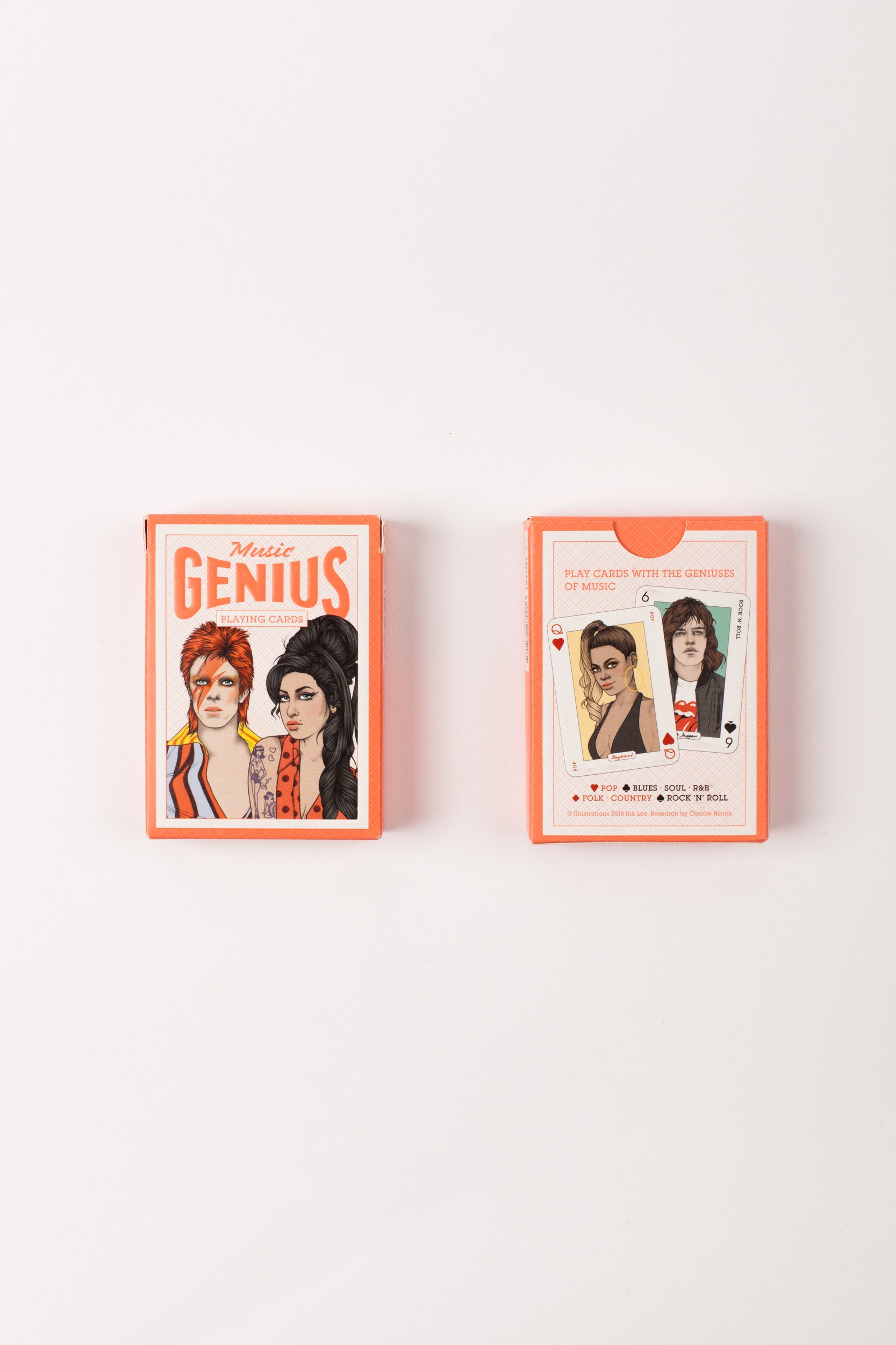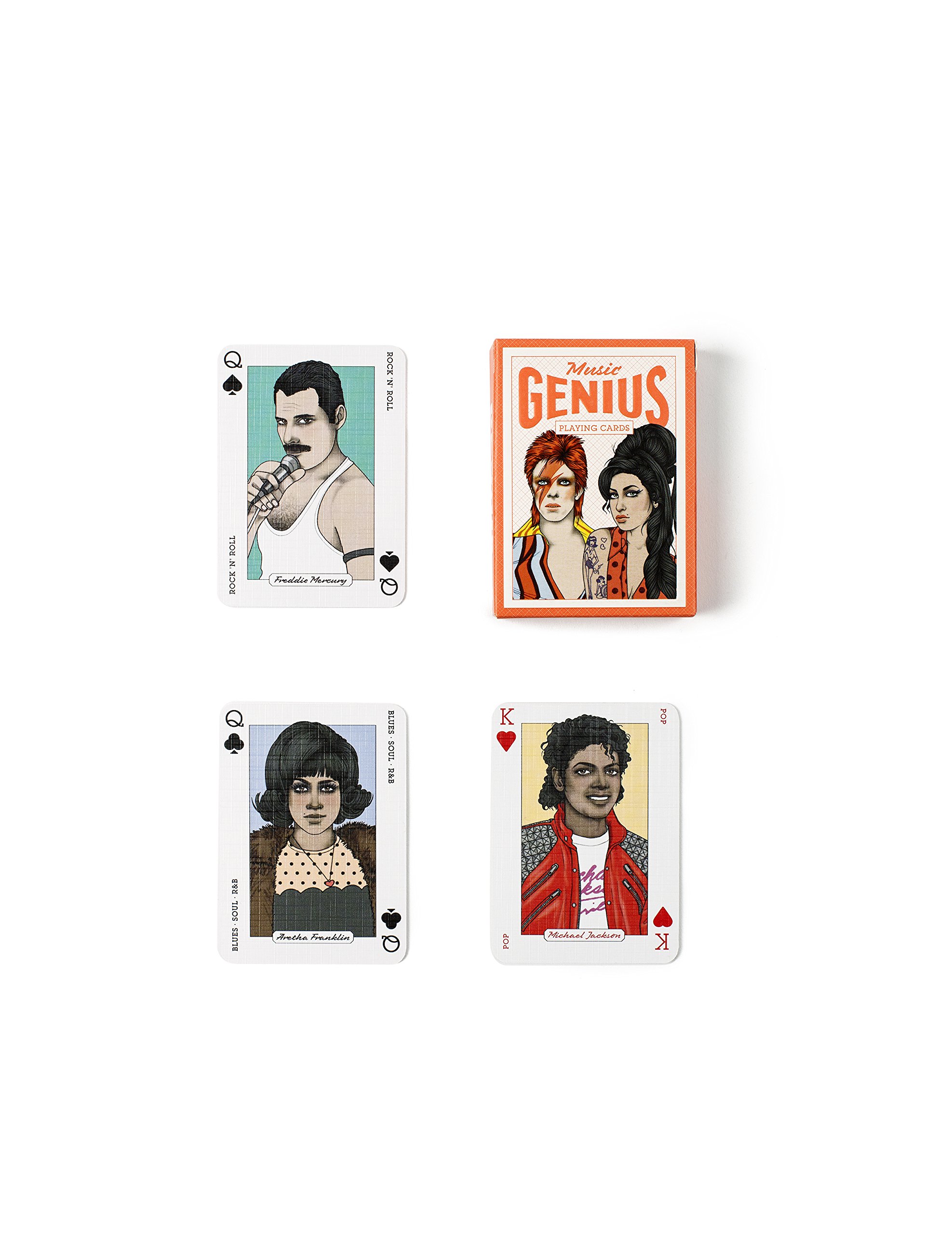 Includes 52 playing cards featuring illustrations of all the big names – including Madonna and Prince in Pop, Kurt Cobain and Jimi Hendrix in Rock, Johnny Cash and Bob Dylan in Folk, and Nina Simone and Amy Winehouse in Blues – plus two jokers (Björk and David Bowie).