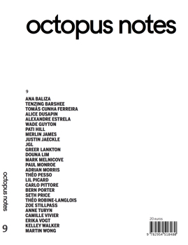 Octopus Notes is a biannual journal that publishes critical essays, academic writings, interviews and artists’ projects. The ninth issue brings together contributions by Ana Baliza, Tenzing Barshee, Tomas Cunha Ferreira, Alice Dusapin, Alexandre Estrela, Wade Guyton, Pati Hill, Merlin James, Justin Jaeckle, JGL, Greer Lankton, Douna Lim, Mark Melnicove, Paul Monroe, Adrian Morris, Lil Picard, Carlo Pittore, Bern Porter, Seth Price, Zoé Stillpass, Théo Robine-Langlois, Anne Turyn, Camille Vivier, Erika Vogt, Kelley Walker, and Martin Wrong.