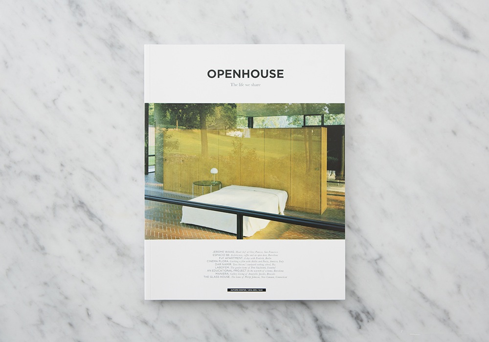 In Openhouse Issue 2 we talk to Jermome Waag, head chef at Chez Panisse, about what he likes to cook at home for his friends in his time off. In Barcelona we take a look at the warehouse space, Espacio 88, that holds an architecture studio, a coffee van in the mornings, and many different pop-ups. We take a peek into the Freunde von Freunden Apartment in Berlin, that takes shape as an office, event space and a cosy apartment for occasional overnight guests. In a small village in the italian countryside, Attillio and Paola live in the old Cinema Flora, and regularly open their doors for film nights. Then we immerse ourselves in the delights of Fez, and Tara Steven’s courtyard cooking school, Dar Namir. Fem Güçlütürk, opens the doors to her home in Istanbul which is also a plant shop and laboratory, Labofem. Back in Barcelona we discover a self made home school for Oihan and his friends. Amaryllis Jacobs has made her wonderful home in Brussels into a twice yearly gallery space, Maniera, for architect designed pieces. And to finish, we fly across the pond to visit the beautiful Glass House, the home of the architect, Philip Johnson.