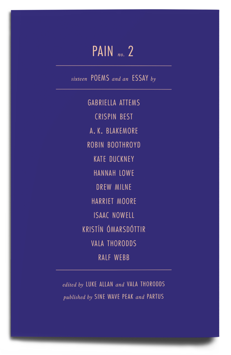 Pain is a print journal dedicated to new poetry and short, creative essays. The magazine launched in September 2017 and is edited by Vala Thorodds and Luke Allan. It is co-published by Partus Press and sine wave peak in Oxford, UK. Design by Luke Allan.