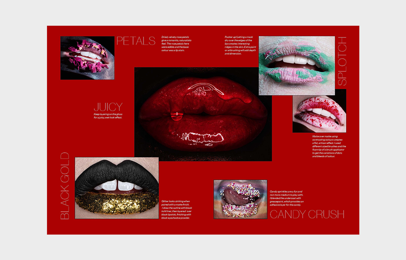 Organized by technical themes, dozens of different looks demonstrate how to use embellishments, glitter and gloss, colour and graphic lines to produce stunning results for the camera or catwalk.