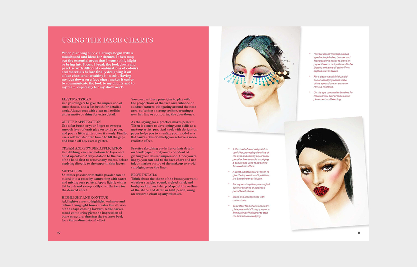 Includes 30 face-chart templates for testing out and adapting your looks, and advice on application and professional presentation.