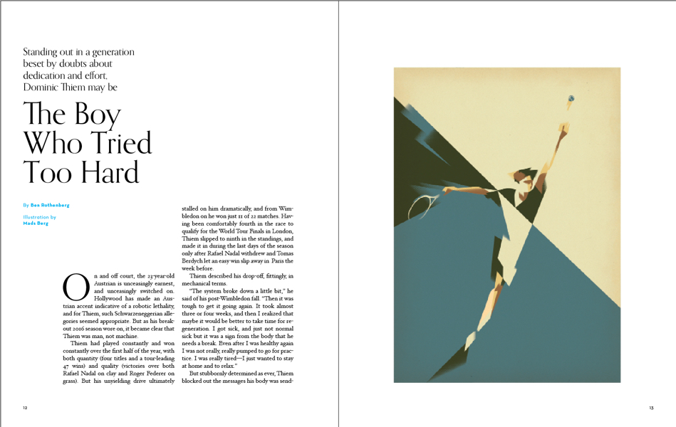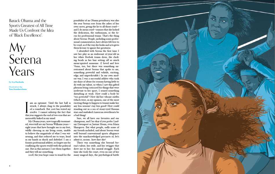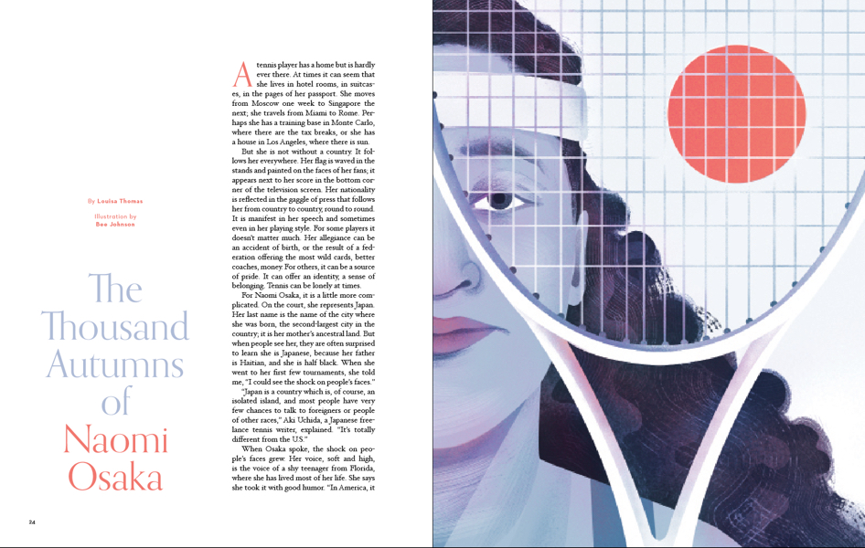 The second issue of Racquet takes a dive into Australasia just in time for the summer Down Under. We take you to the land of a thousand autumns, where Naomi Osaka (right) is part of a new Japanese tennis generation. The Naomi Osaka illustrations (see Gallery Images) are by Bee Johnson and are part of a story by famed tennis writer Louisa Thomas.