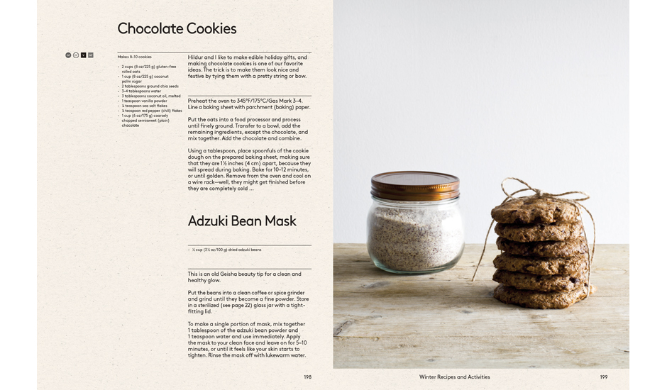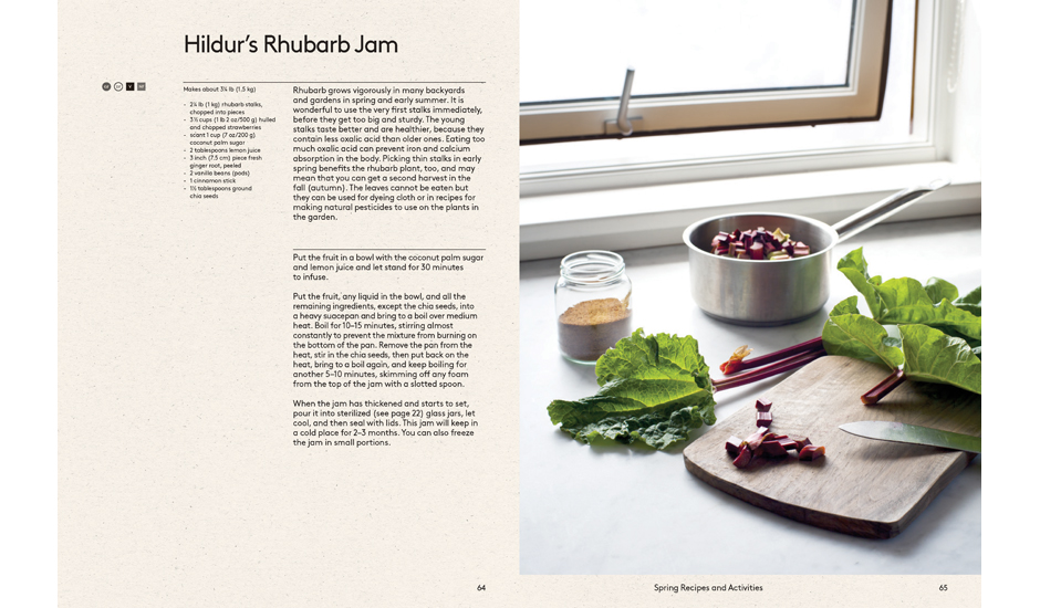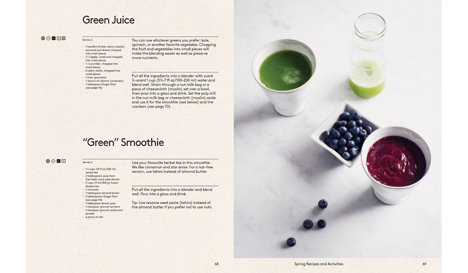 After each chapter of recipes there is a seasonal recipe and activity section, which explores some wider lifestyle elements of living healthily, for example growing vegetables in small spaces, dying cloth with turmeric in summer, picking wild berries in fall, and making holiday gifts in winter.