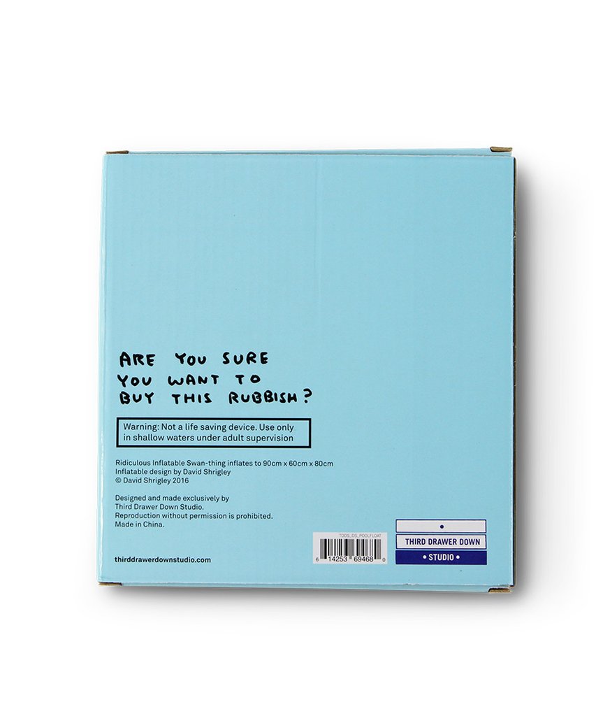 Originally designed as a limited edition sculptural piece, cast in heavy polyurethane resin, the David Shrigley Swan has been blown up, literally. This inflatable swan may be missing the graceful curves true to a classic swan, but with its hand-drawn blank expression and erect white neck, it knows exactly what it is, it is a “Ridiculous Inflatable Swan-Thing”. Named lovingly by David Shrigley himself, the statuesque swan stands at 35 inches tall and comprises all that is to love about Shrigley’s charismatic work, while also being pool-ready.