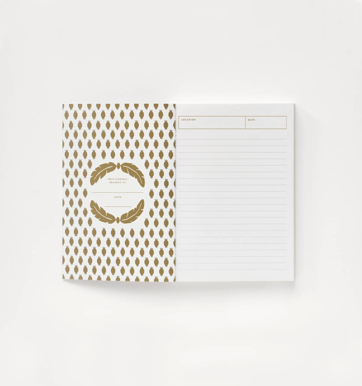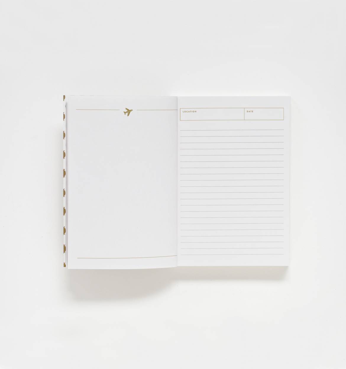 Record all of your global adventures in style with the Bon Voyage Journal! This journal features a soft linen cover printed with an illustrated map of the world, smythe sewn binding for durability, and luxurious interior pages printed with metallic gold lines and accents.
