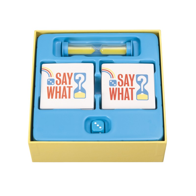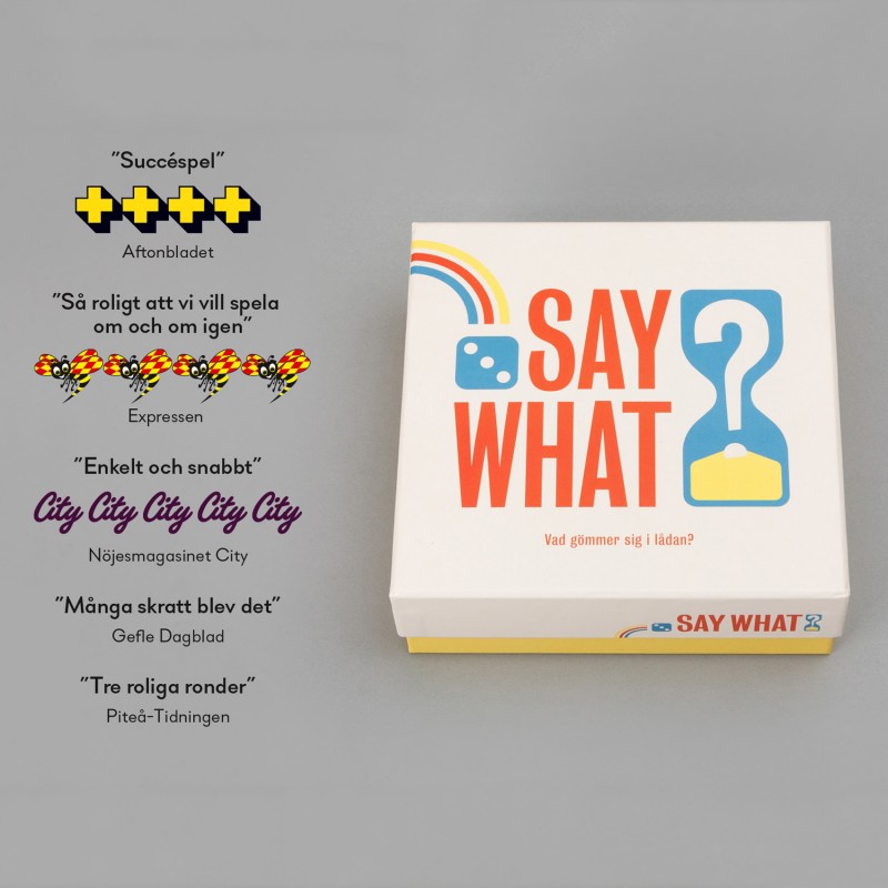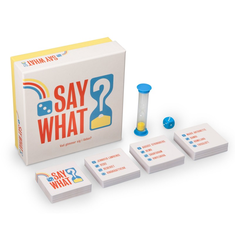 Say What är ett spel för festen eller kalaset, bjudningen eller släktträffen. Ett spel som erbjuder stor omväxling och kan spelas om och om igen. Det är lätt att lära sig, går snabbt att spela och passar ett stort åldersspann. I lådan trängs 640 filmer, böcker, serier, karaktärer, prylar och verkliga personer tillsammans med specialdesignad tärning och timglas.