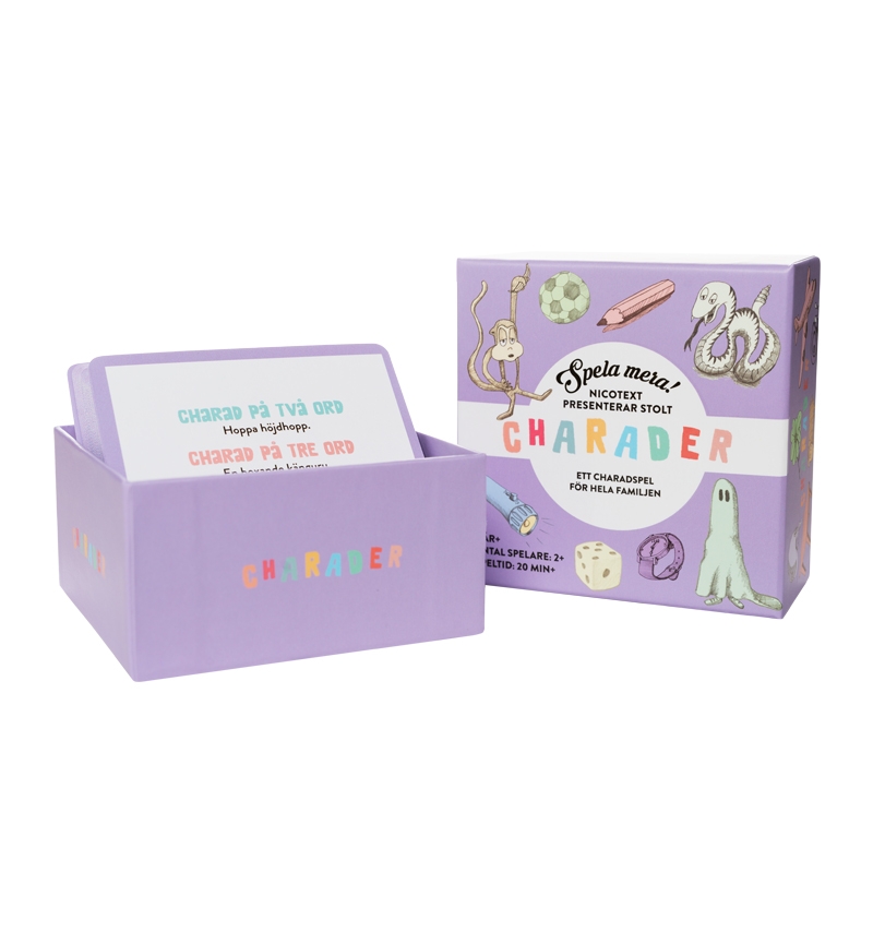 Spela mera: Charader är ett underhållande spel som passar både till middagsbjudningen och barnkalaset. Charaderna är uppdelade i fyra olika kategorier som tar upp allt från Pippi Långstrump till svenska ordspråk. På spelkortens baksida finns även enkla illustrationer för de allra minsta.