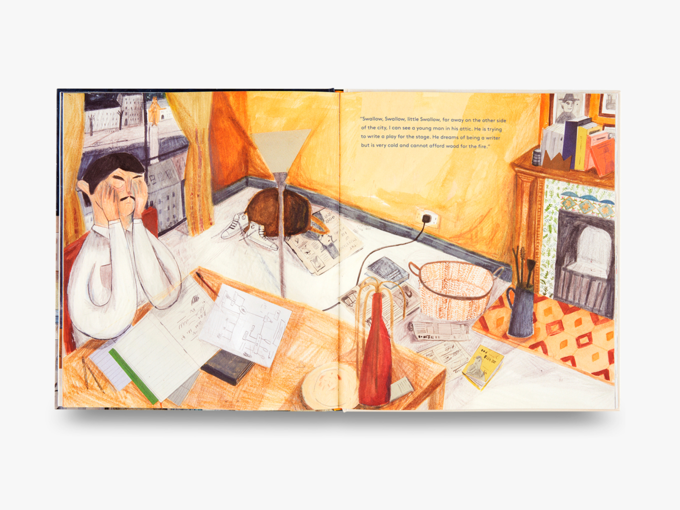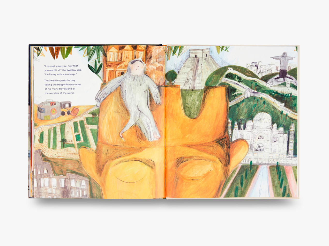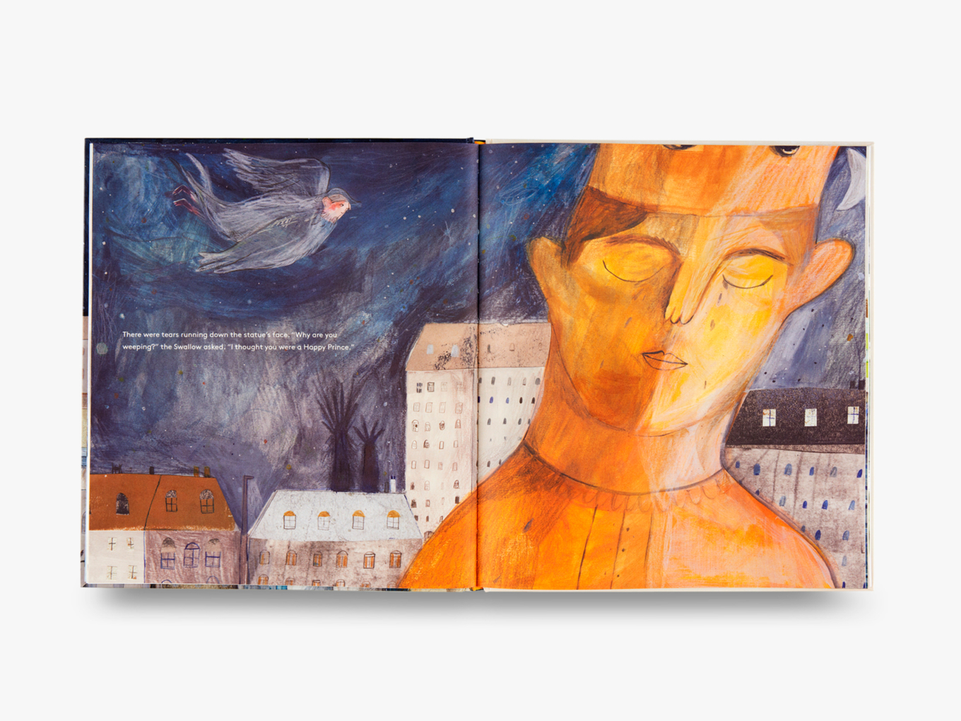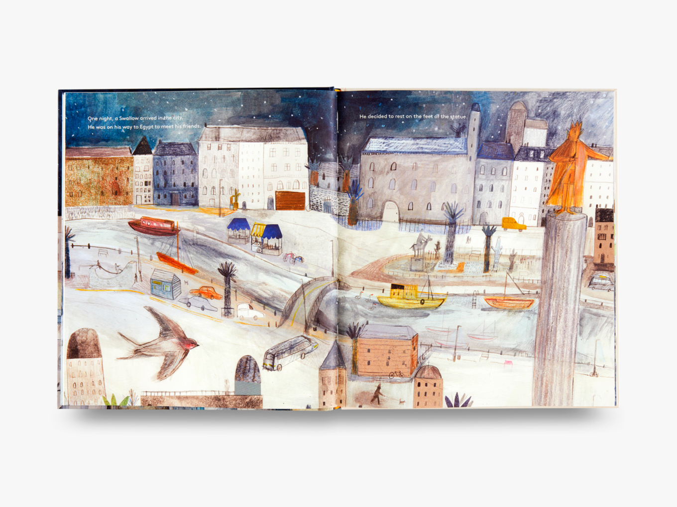 ‘One night a swallow arrived in the city. He was on his way to Egypt to meet his friends, but he decided to rest on the feet of the statue. The swallow was very happy with his golden perch. But as he drifted off to sleep, a large drop of water fell on him. This was odd, because the night sky was clear and warm. Then another drop fell on him. When the third drop fell, the swallow wondered if he should find a new place to sleep. Then he looked up…’