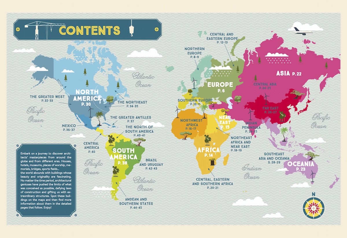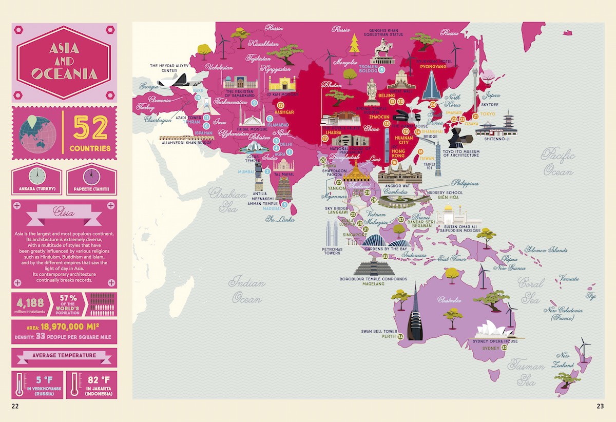 Sarah Tavernier and Alexandre Verhille have already deftly shown with Legendary Routes of the World that they are experts in showcasing the biggest and the best. Now, for The Illustrated Atlas of Architecture and Marvelous Monuments, they researched the longest bridges, tallest towers, the most impressive cultural sites, and plenty of curiosities. Exciting facts are woven together with a myriad of architectural styles; the material feats are skillfully and artfully placed upon bold maps, situating the constructions within a geographic context.