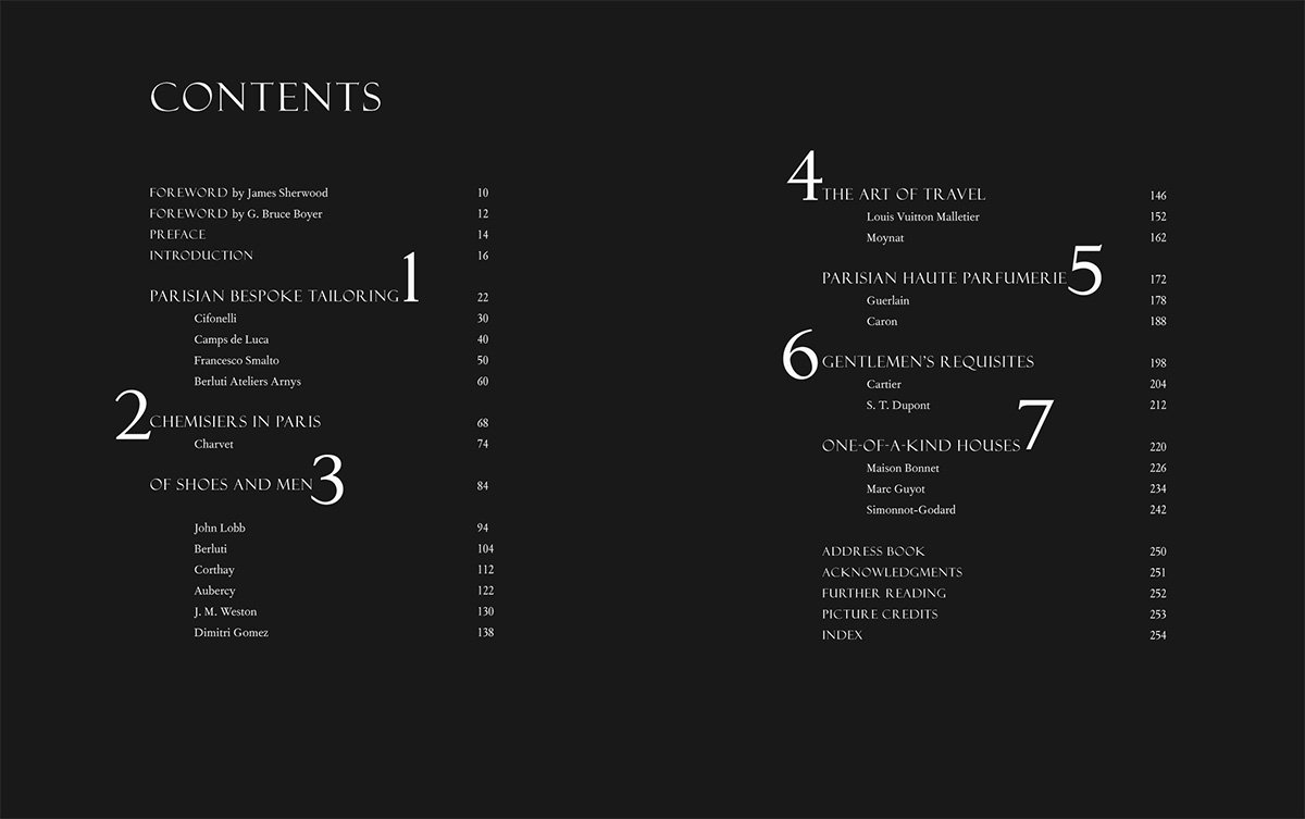 Preface • Introduction • 1. The Parisian Bespoke Tailoring: Cifonelli; Camps de Luca; Francesco Smalto; Berluti Atelier Arnys • 2. Of Men and Shoes: Men and Shoes, a contemporary love story: John Lobb; Berluti; Corthay; Aubercy; J.M. Weston; Dimitri Gomez • 3. Chemisiers in Paris: Charvet • 4. The Art of Travelling: Louis Vuitton special orders; Moynat Paris • 5. Parisian Haute Parfumerie: Guerlain; Caron • 6. Gentlemen’s