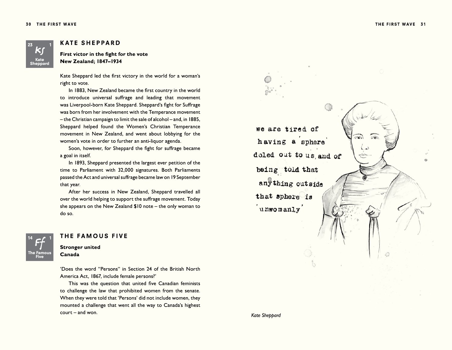 While the narrative takes the reader through feminisms struggle from the first wave to the fourth, the table offers a key to understanding how these women and the battles they fought speak to each other across time and continents: if you’re inspired by Sheryl Sandberg, prepared to be equally wowed by Frances Harper and Alison Bechdel.