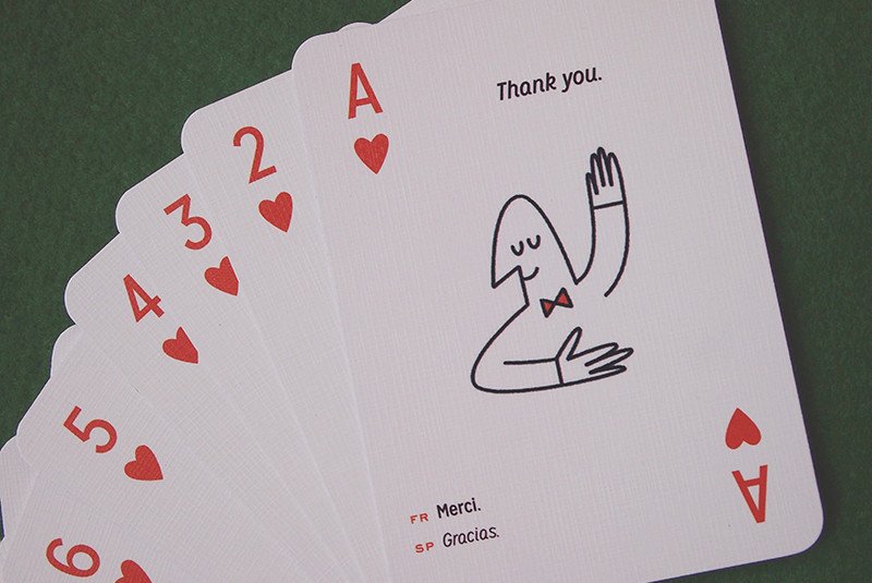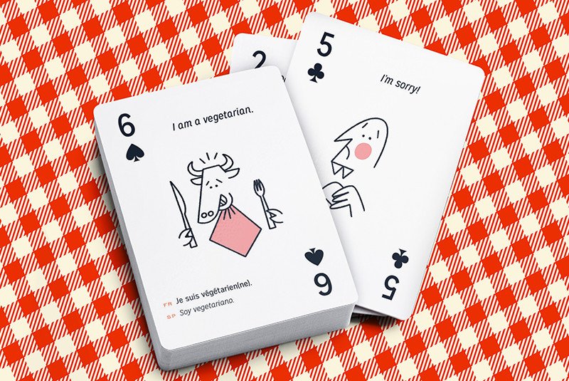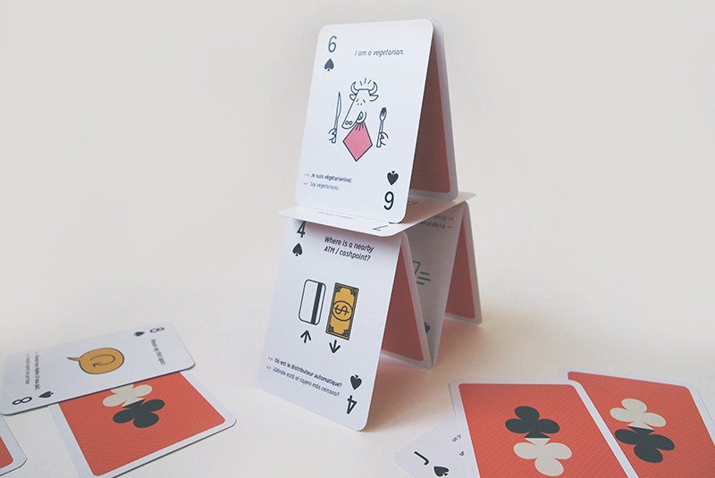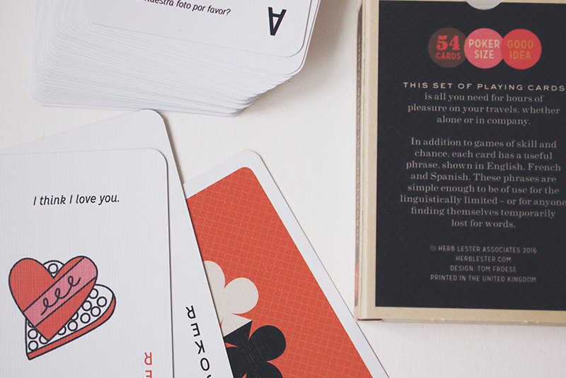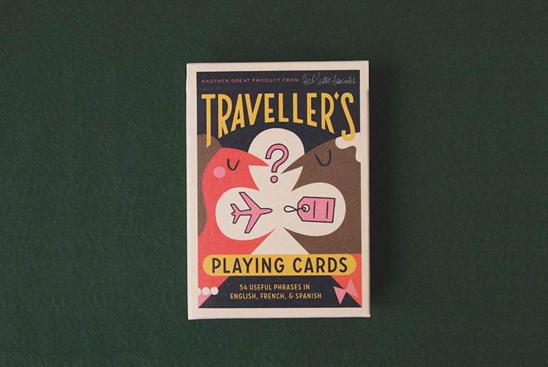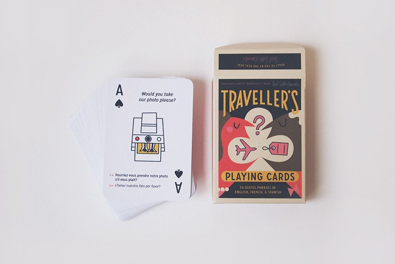 Designed for us by Tom Froese, our playing cards evoke an earlier, less stressful era of travel but uses phrases handy for the 21st century traveller: Where can I charge my phone? Do you have wifi? Where’s the nearest ATM? Do you mind if I take a photo?