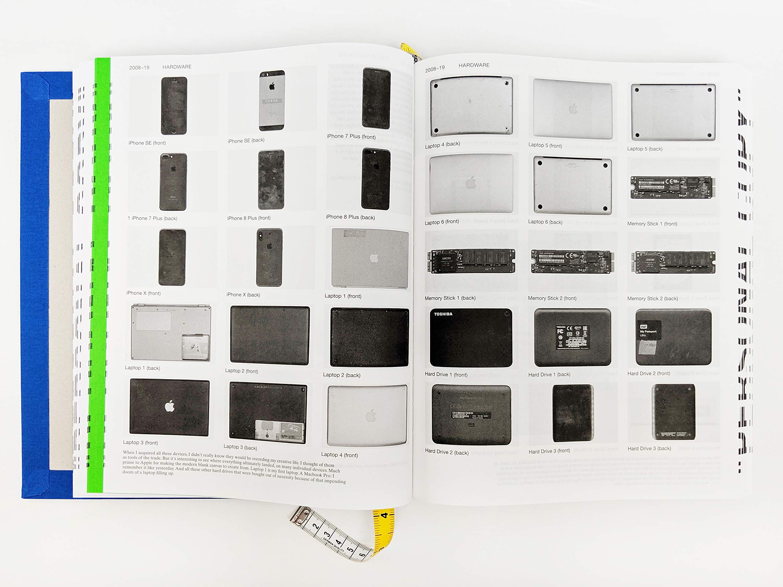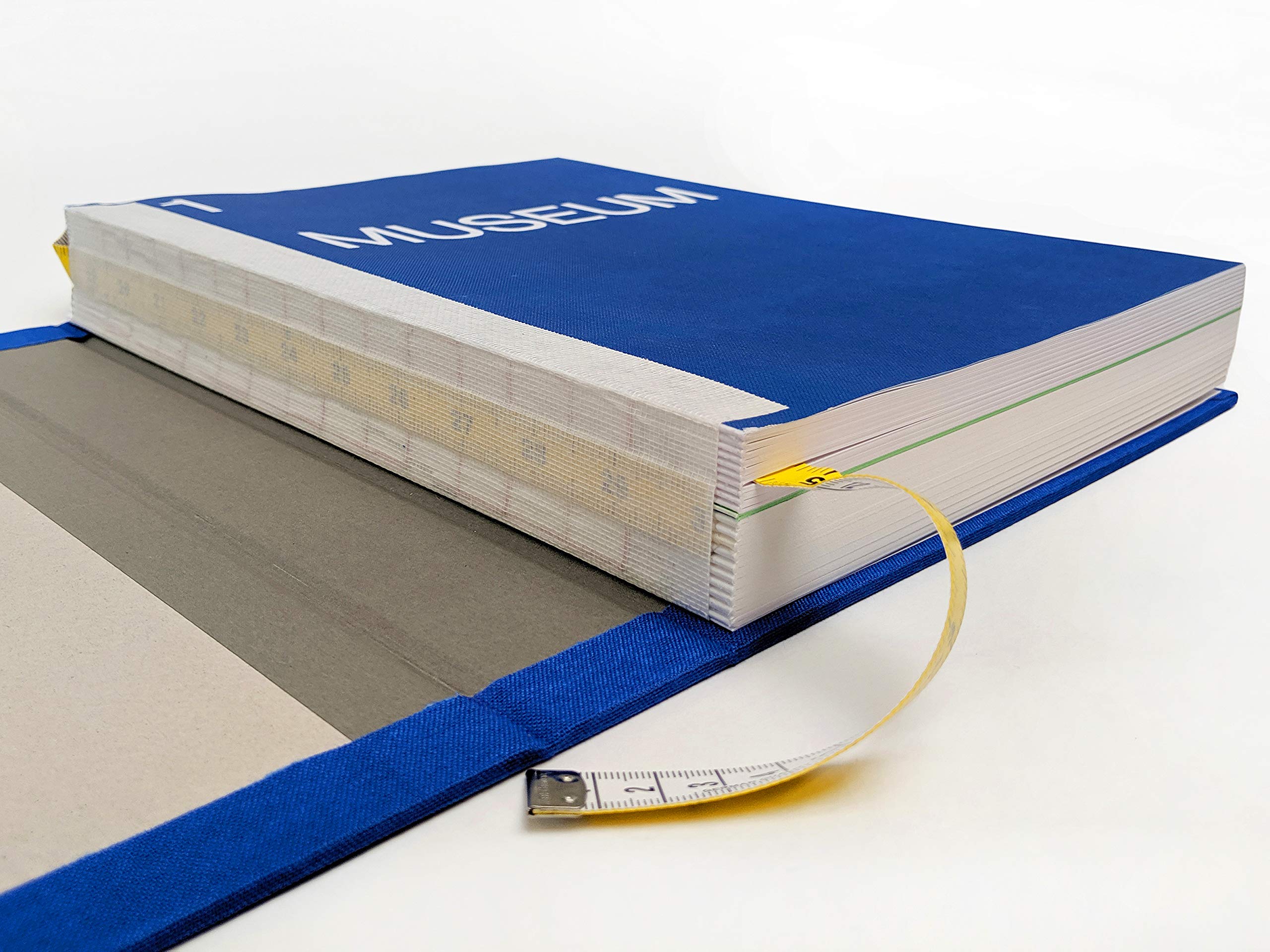 This book is designed with Swiss binding. When opened the front cover lays completely flat and is not attached to the front pages of the book. The binding also intentionally exposes the spine of the bound book and the raw boards used for the case (cover).